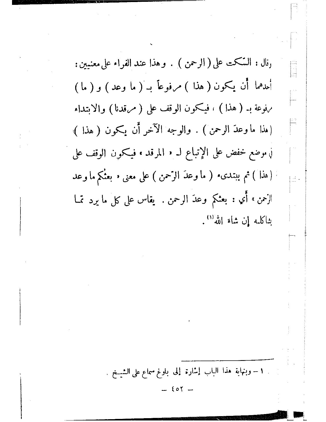 أحدهما أن يكون (هذا) مرفوعًا بـ (ما وعد) و (ما) مرفوعة بـ (هذا)، فيكون الوقف على (مرقدنا) والابتداء (هذا ما وعد الرحمن). والوجه الآخر أن يكون (هذا) في موضع خفض على الإتباع لـ «المرقد» فيكون الوقف على (هذا) ثم يبتديء (ما وعد الرحمن) على معنى «بعثكم ما وعد الرحمن» أي: بعثكم وعد الرحمن. يقاس على كل ما يرد مما يشاكله إن شاء الله.