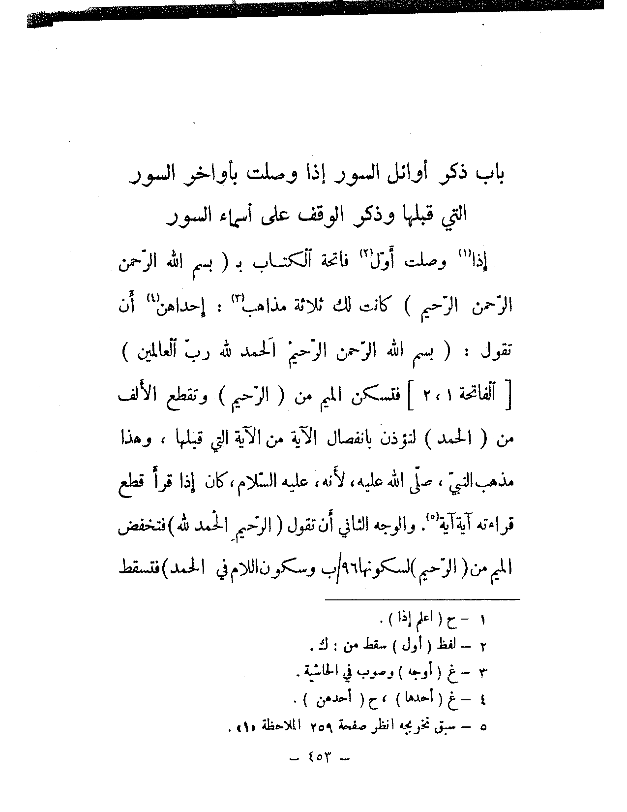 إذا وصلت أول فاتحة الكتاب بـ (بسم الله الرحمن الرحيم) كانت لك ثلاثة مذاهب: إحداهن أن تقول: {بسم الله الرحمن الرحيم الحمد لله رب العالمين} [الفاتحة: 1، 2] فتسكن الميم من (الرحيم) وتقطع الألف من (الحمد) لتؤذن بانفصال الآية التي قبلها، وهذا مذهب النبي صلى الله عليه وسلم، لأنه عليه السلام، كان إذا قرأ قطع قراءته آية آية. والوجه الثاني أن تقول (الرحيم الحمد لله) فتخفض الميم من (الرحيم) لسكونها وسكون اللام في (الحمد فتسقط