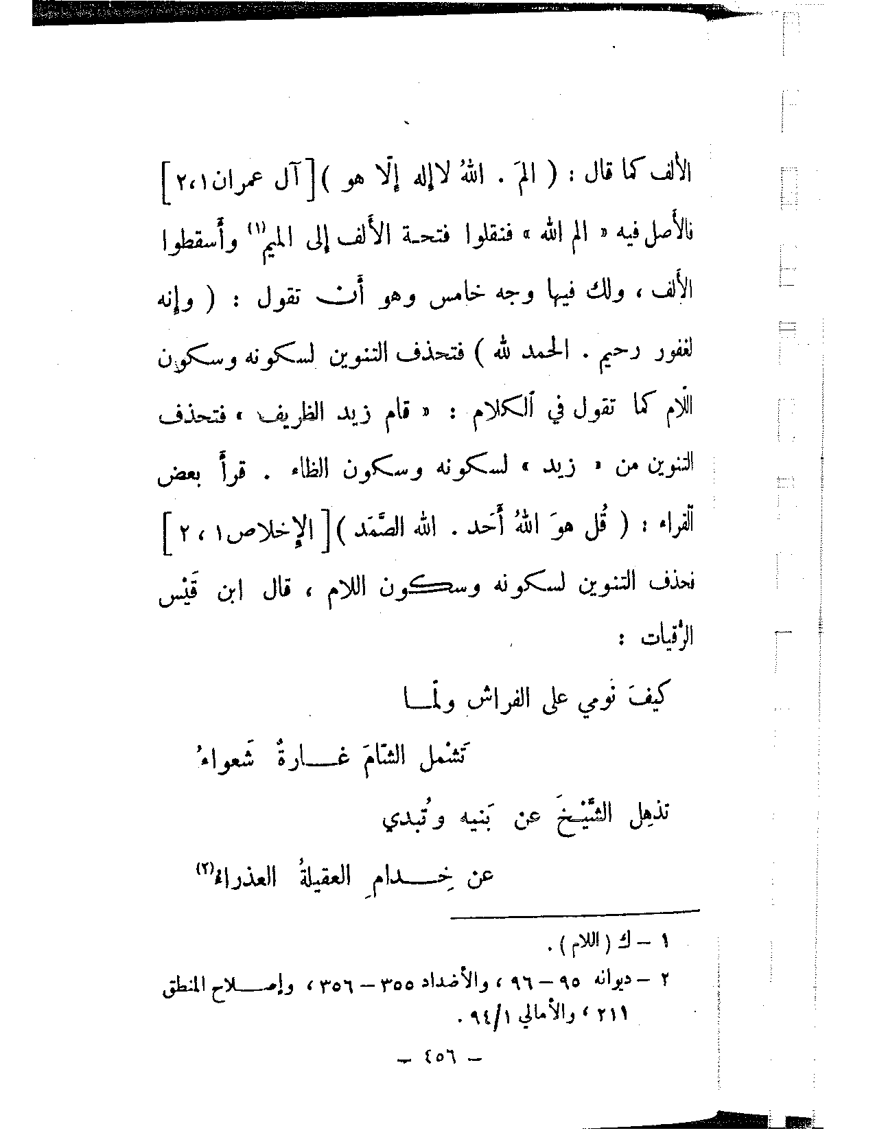 الألف كما قال: {الم. الله لا إله إلا هو} [آل عمران: 1، 2] فالأصل فيه «الم الله» فنقلوا فتحة الألف إلى الميم وأسقطوا الألف، ولك فيها وجه خامس وهو أن تقول: (وإنه لغفور رحيم. الحمد لله) فتحذف التنوين لسكونه وسكون اللام كما تقول في الكلام: «قام زيد الظريف» فتحذف التنوين من «زيد» لسكونه وسكون الظاء. قرأ بعض القراء: {قل هو الله أحد. الله الصمد} [الإخلاص: 1، 2] فحذف التنوين لسكونه وسكون اللام، قال ابن قيس الرقيات: