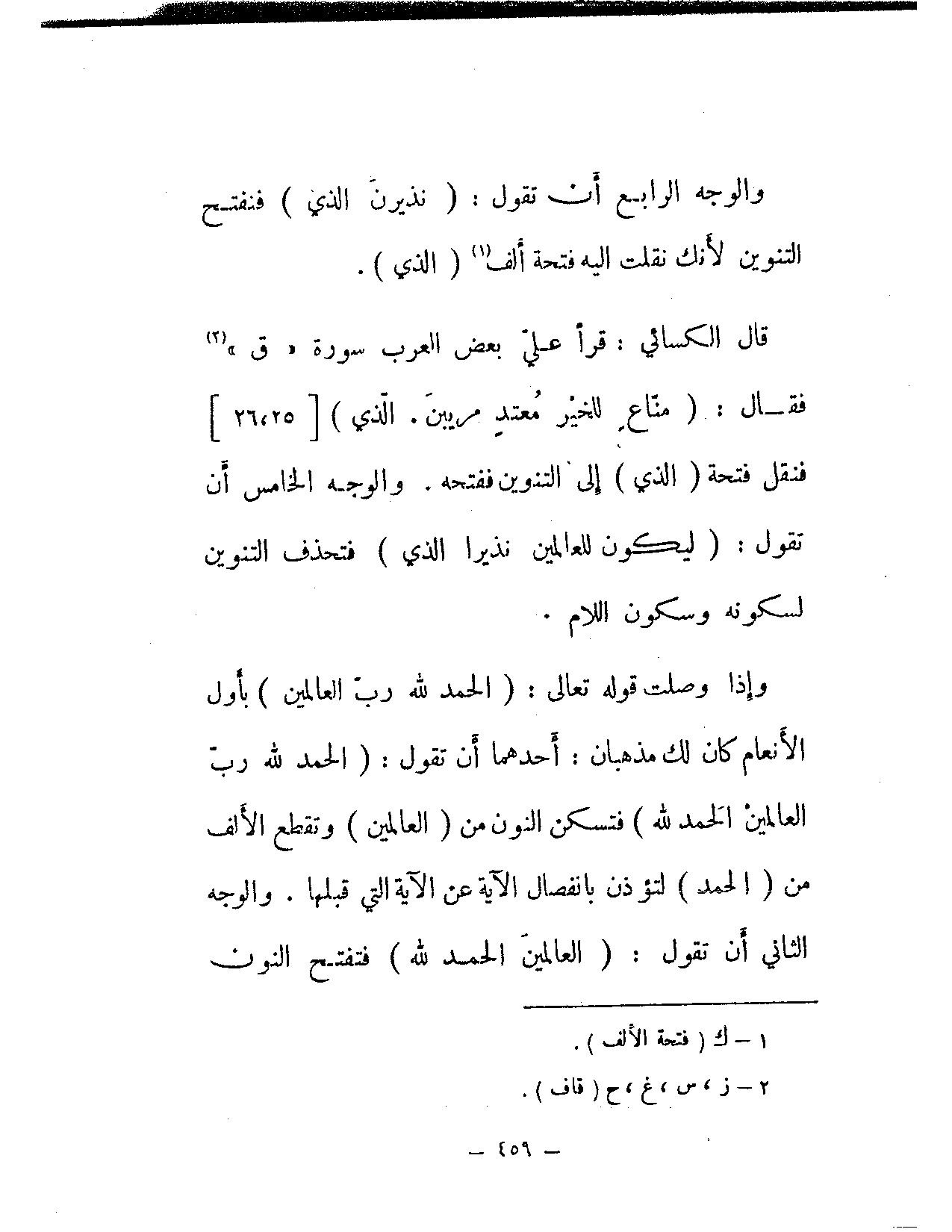 قال الكسائي: قرأ علي بعض العرب سورة «ق» فقال: {مناع للخير معتد مريبن. الذي} [25، 26] فنقل فتحة (الذي) على التنوين ففتحه. والوجه الخامس أن تقول: (ليكون للعالمين نذيرا الذي) فتحذف التنوين لسكونه وسكون اللام.