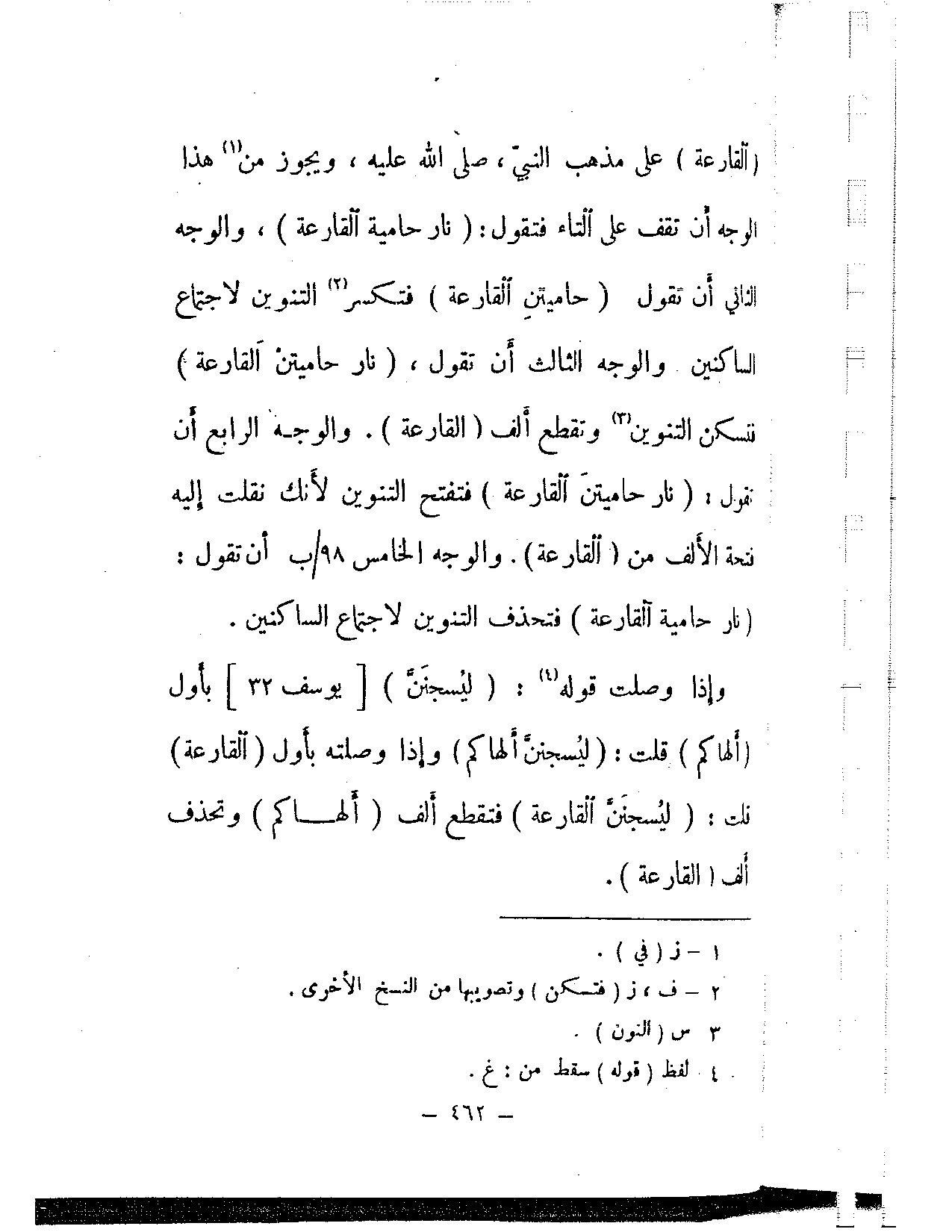 (القارعة) على مذهب النبي صلى الله عليه وسلم، ويجوز من هذا الوجه أن تقف على التاء فتقول: (نار حامية القارعة)، والوجه الثاني أن تقول (حاميتن القارعة) فتكسر التنوين لاجتماع الساكنين والوجه الثالث أن تقول، (نار حاميتن القارعة) فتسكن التنوين وتقطع ألف (القارعة). والوجه الرابع أن تقول: (نار حاميتن القارعة) فتفتح التنوين لأنك نقلت إليه فتحة الألف من (القارعة) فتفتح التنوين لأنك نقلت إليه فتحة الألف من (القارعة). والوجه الخامس أن تقول: (نار حامية القارعة) فتحذف التنوين لاجتماع الساكنين.