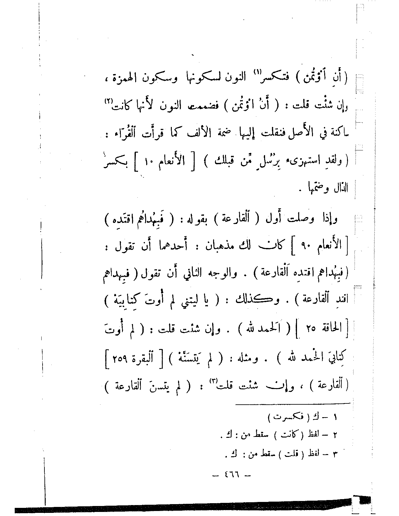 وإذا وصلت أول (القارعة) بقوله: {فهبداهم اقتده} [الأنعام: 90] كان لك مذهبان: أحدهما أن تقول: (فبهداهم اقتده القارعة). والوجه الثاني أن تقول (فبهداهم اقتد القارعة). وكذلك: {يا ليتني لم أوت كتابيه} [الحاقة: 25] (الحمد لله). وإن شئت قلت: (لم أوت كتابي الحمد لله). ومثله: {لم يتسنه} [البقرة: 259] (القارعة)، وإن شئت قلت: (لم يتسن القارعة)