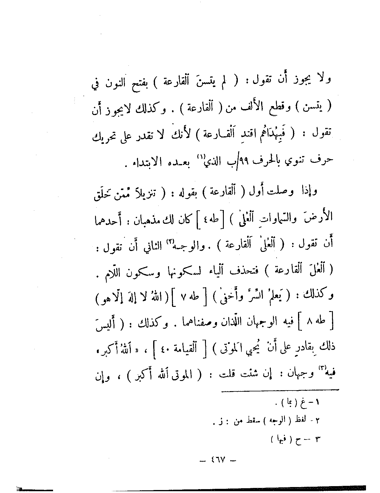 وإذا وصلت أول (القارعة) بقوله: {تنزيلا ممن خلق الأرض والسماوات العلي} [طه: 4] كان لك مذهبان: أحدهما أن تقول: (العلي القارعة). والوجه الثاني أن تقول: (العل القارعة) فتحذف الياء لسكونها وسكون اللام. وكذلك: {يعلم السر وأخفى} [طه: 7] {الله لا إله إلا هو} [طه: 8] فيه الوجهان اللذان وصفناهما. وكذلك: {أليس ذلك بقادر على أن يحيى الموتى} [القيامة: 40] «الله أكبر» فيه وجهان: إن شئت قلت: (الموتى الله أكبر)، وإن