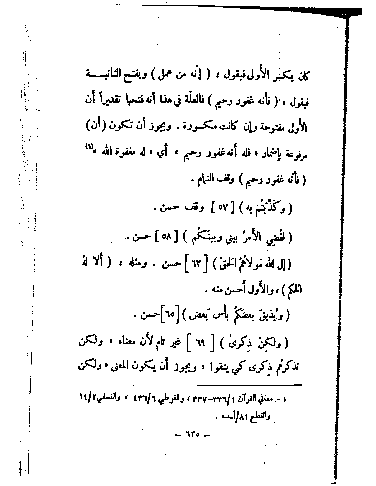 كان يكسر الأولى فيقول: (إنه من عمل) ويفتح الثانية فيقول: (فأنه غفور رحيم) فالعلة في هذا أنه فتحها تقديرًا أن الأولى مفتوحة وإن كنت مكسورة. ويجوز أن تكون (أن) مرفوعة بإضمار «فله أنه غفور رحيم» أي «له مغفرة الله» (فأنه غفور رحيم) وقف التمام.