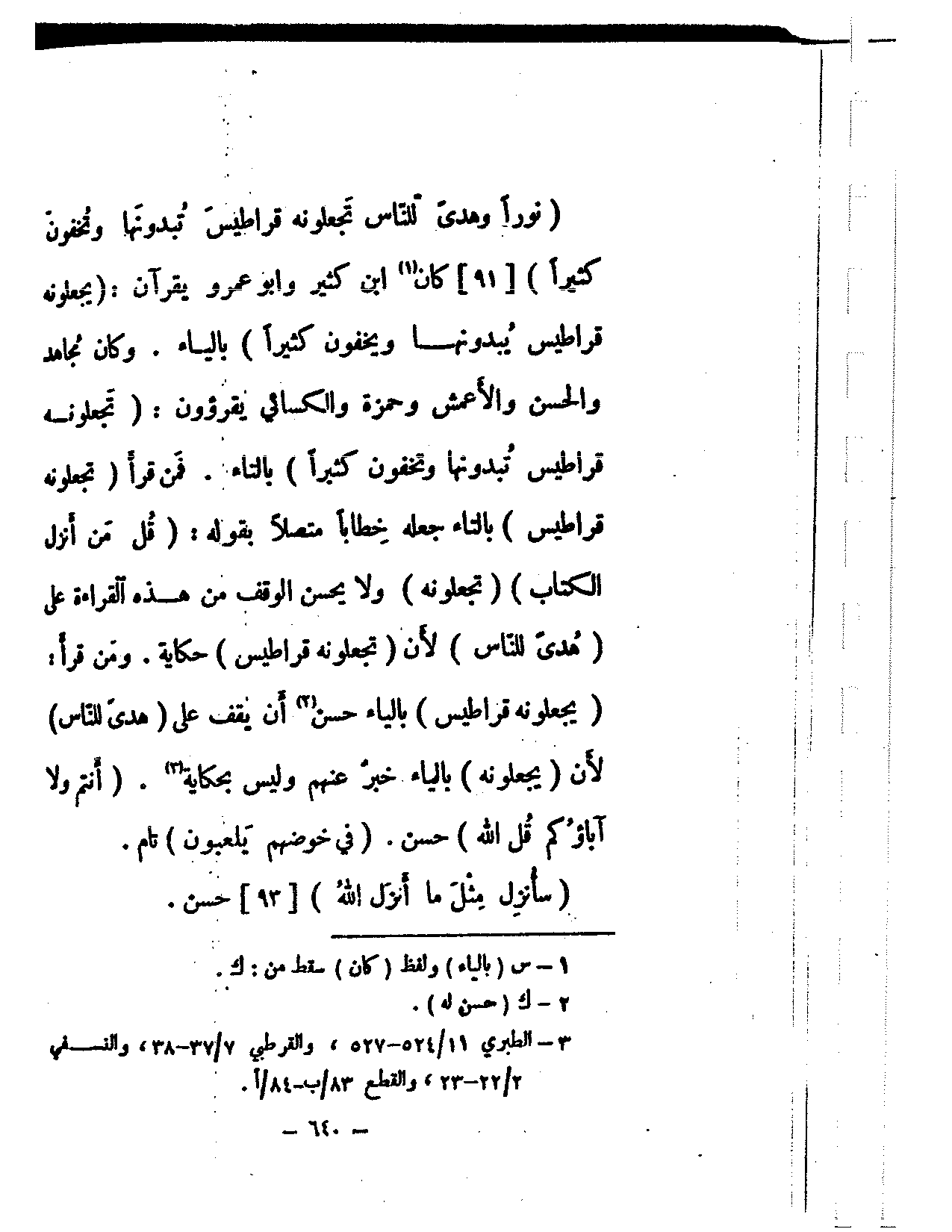 (نورا وهدى للناس تجعلونه قراطيس تبدونها وتخفون كثيرا) [91] كان ابن كثير وأبو عمرو يقرآن: (يجعلونه قراطيس يبدونها ويخفون كثيرا) بالياء. وكان مجاهد والحسن والأعمش وحمزة والكسائي يقرؤون: (تجعلونه قراطيس تبدونها وتخفون كثيرا) بالتاء. فمن قرأ (تجعلونه قراطيس) بالتاء جعله خطابا متصلاً بقوله: (قل من أنزل الكتاب) (تجعلونه) ولا يحسن الوقف من هذه القراءة على (هدى للناس) لأن (تجعلونه قراطيس) حكاية. ومن قرأ: (يجعلونه قراطيس) بالياء حسن أن يقف على (هدى للناس) لأن (يجعلونه) بالياء خبر عنهم وليس بحكاية. (أنتم ولا آباؤكم قل الله) حسن. (في خوضهم يلعبون) تام.