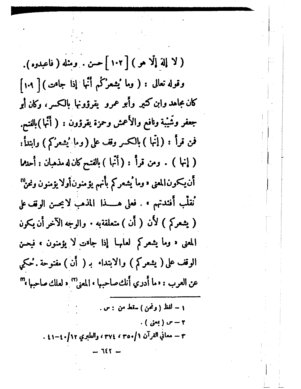 وقوله تعالى: (وما يشعركم أنها إذا جاءت) [109] كان مجاهد وابن كثير وأبو عمرو يقرؤونها بالكسر، وكان أبو جعفر وشيبة ونافع والأعمش وحمزة يقرؤون: (أنها) بالفتح. فمن قرأ: (إنها) بالكسر وقف على (وما يشعركم) وابتدأ: (إنها). ومن قرأ: (أنها) بالفتح كان له مذهبان: أحدهما أن يكون المعنى «وما يشعركم بأنهم يؤمنون أولا يؤمنون ونحن نقلب أفئدتهم». فعلى هذا المذهب لا يحسن الوقف على (يشعركم) لأن (أن) متعلقة به. والوجه الآخر أن يكون المعنى «وما يشعركم لعلها إذا جاءت لا يؤمنون» فيحسن الوقف على (يشعركم) والابتداء بـ (أن) مفتوحة. حُكي عن العرب: «ما أدري أنك صاحبها» المعنى «لعلك صاحبها»
