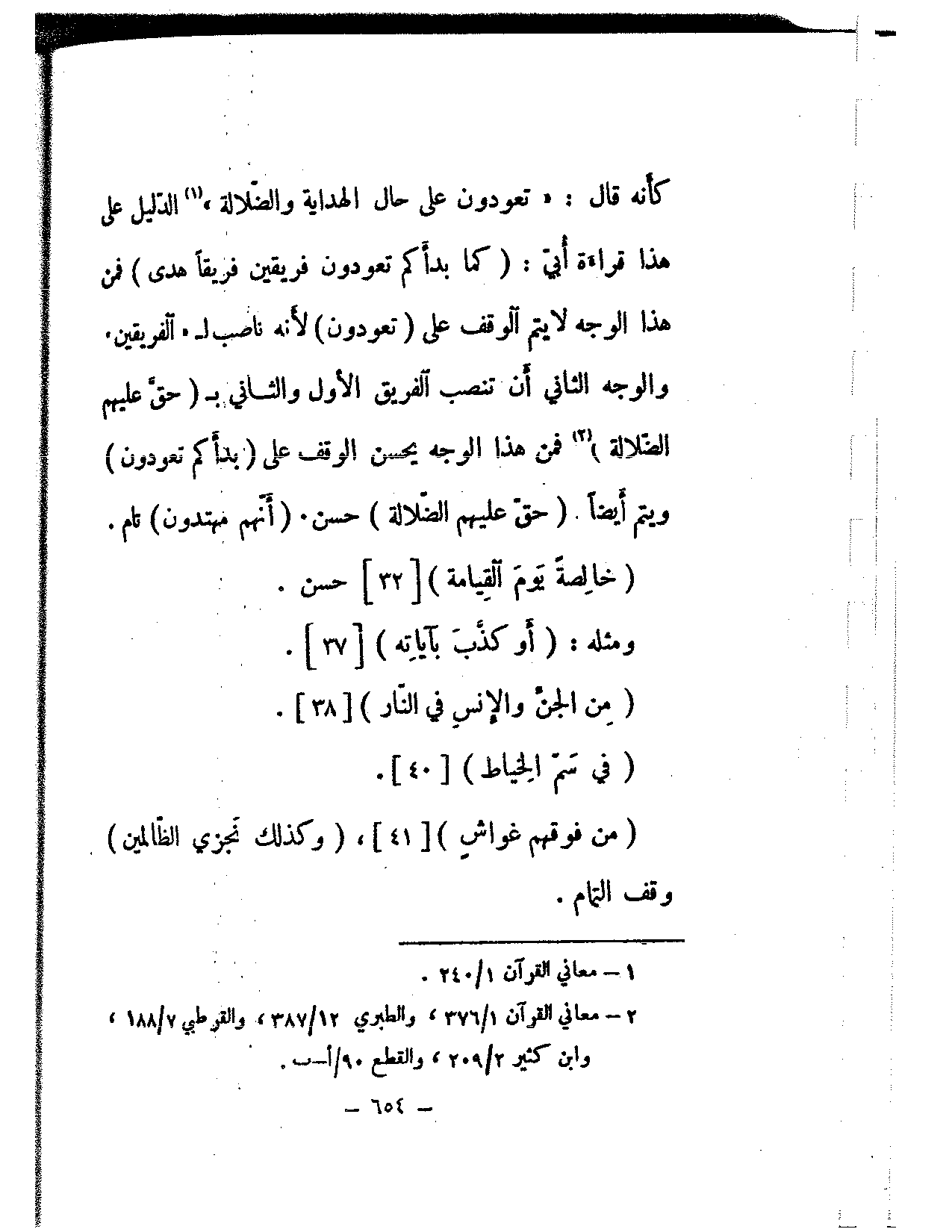 كأنه قال: «تعودون على حال الهداية والضلالة» الدليل على هذا قراءة أبي: (كما بدأكم تعودون فريقين فريقا هدى) فمن هذا الوجه لا يتم الوقف على (تعودون) لأنه ناصب لـ «الفريقين» والوجه الثاني أن تنصب الفريق الأول والثاني بـ (حق عليهم الضلالة) فمن هذا الوجه يحسن الوقف على (بدأكم تعودون) ويتم أيضًا (حق عليهم الضلالة) حسن. (أنهم مهتدون) تام.