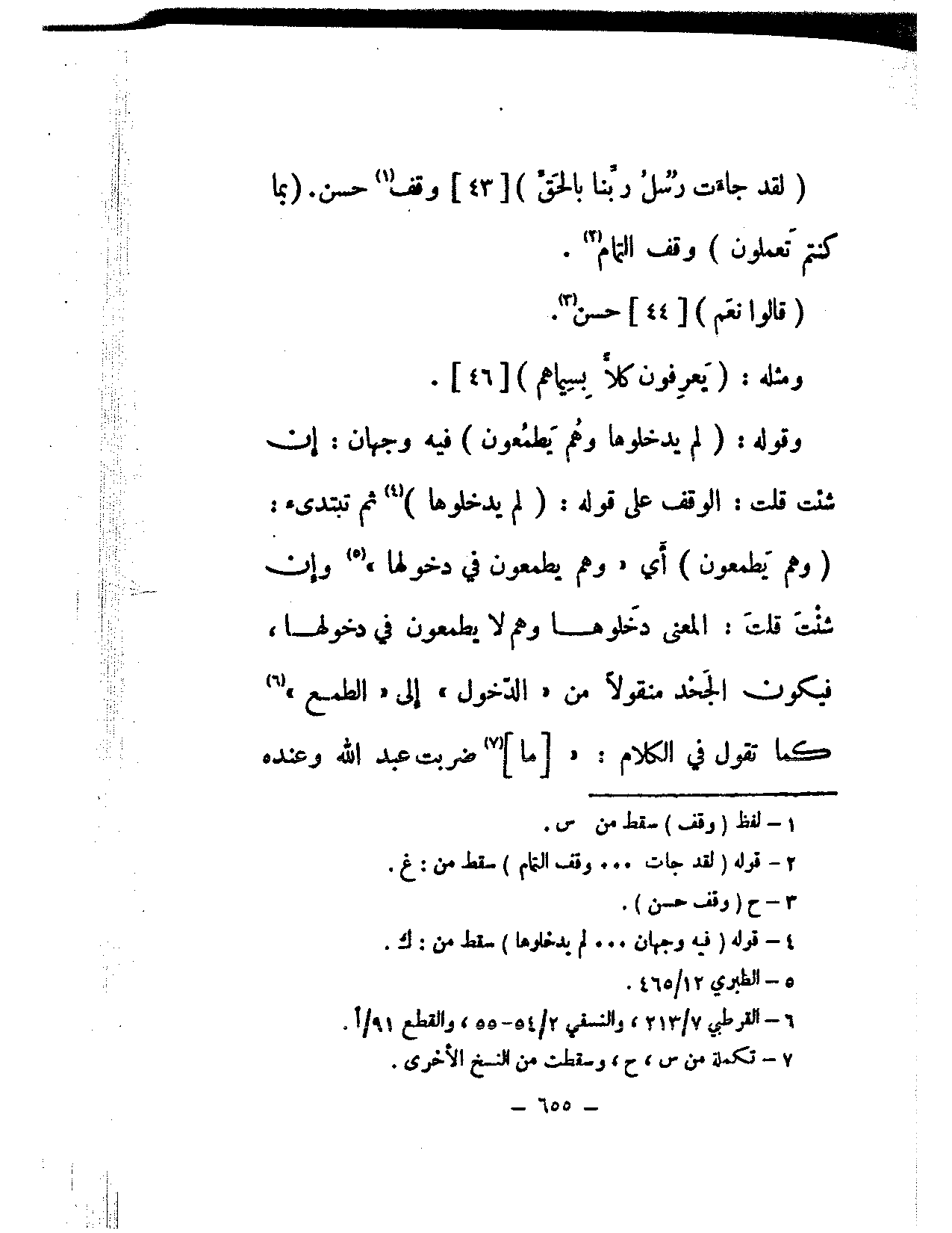 (لقد جاءت رسل ربنا بالحق) [43] وقف حسن. (بما كنتم تعملون) وقف التمام.