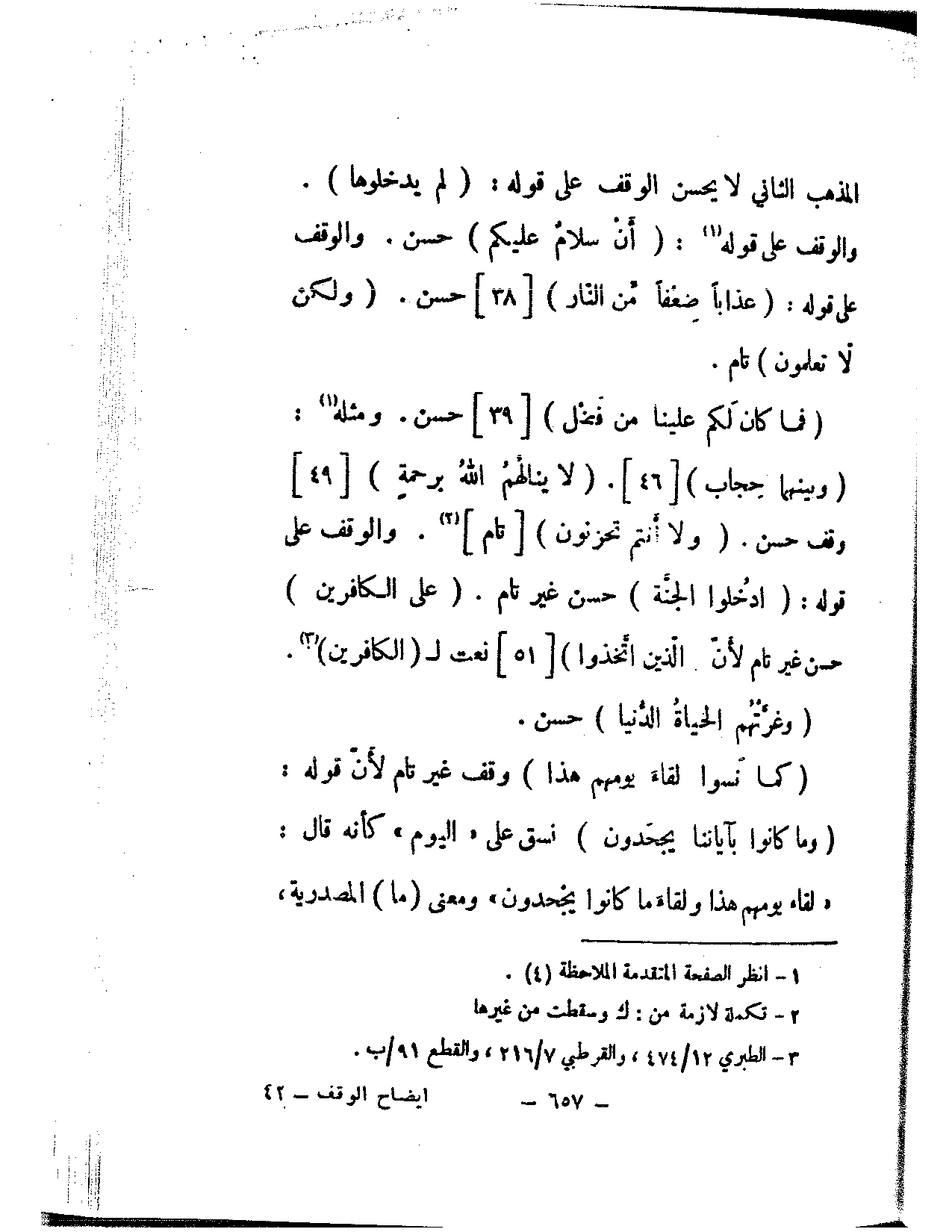 المذهب الثاني لا يحسن الوقف على قوله: (لم يدخلوها). والوقف على قوله: (أن سلام عليكم) حسن. والوقف على قوله: (عذابًا ضعفا من النار) [38] حسن. (ولكن لا تعلمون) تام.