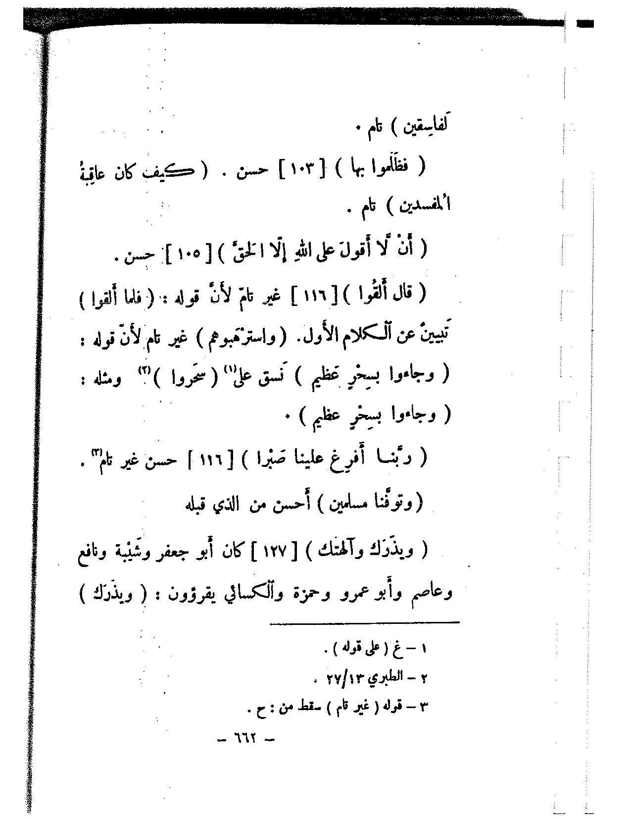 (قال ألقوا) [116] غير تام لأن قوله: (فلما ألقوا) تبيين عن الكلام الأول. (واسترهبوهم) غير تام لأن قوله: (وجاءوا بسحر عظيم) نسق على (سحروا) ومثله: (وجاءوا بسحر عظيم)