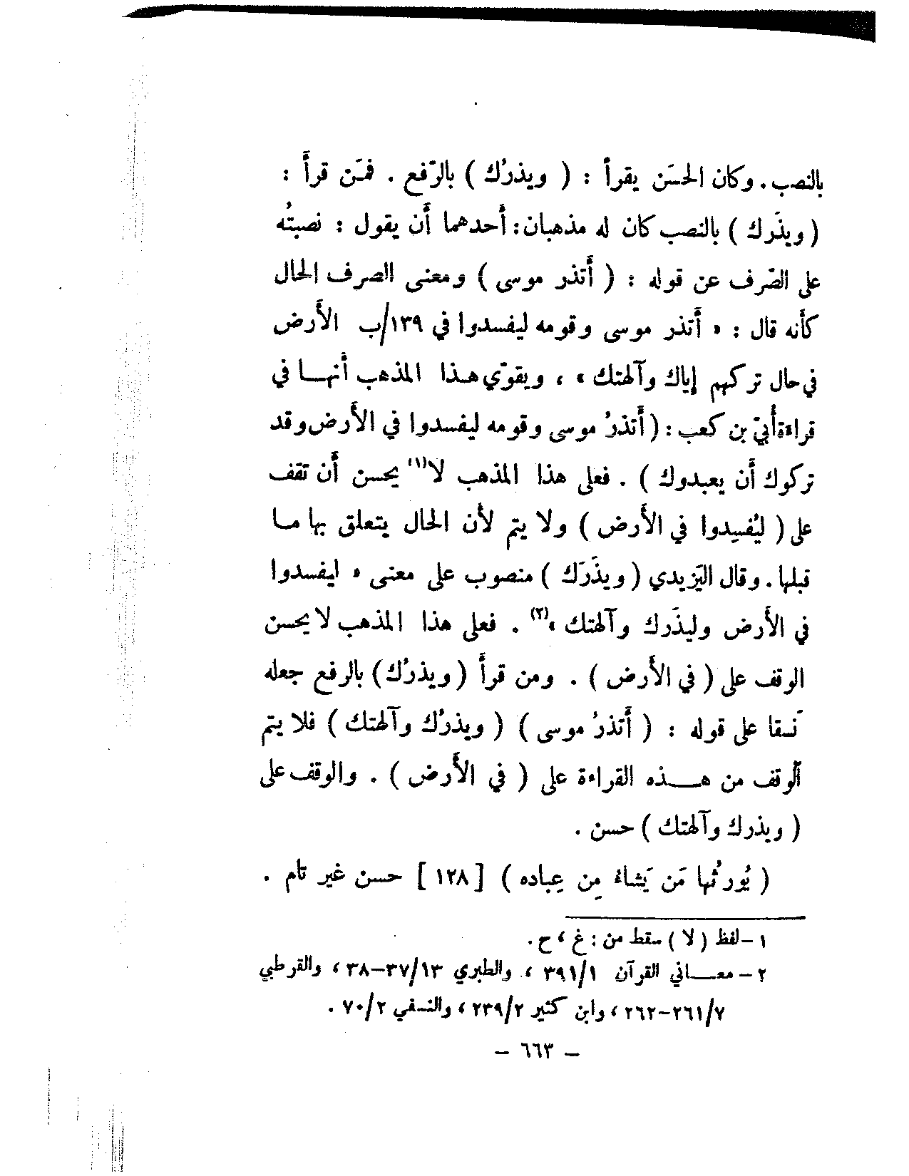 بالنصب. وكان الحسن يقرأ: (ويذرك) بالرفع. فمن قرأ: (ويذرك) بالنصب كان له مذهبان: أحدهما أن يقول: نصبته على الصرف عن قوله: (أتذر موسى) ومعنى الصرف الحال كأنه قال: «أتذر موسى وقومه ليفسدوا في الأرض في حال تركهم إياك وآلهتك»، ويقوي هذا المذهب أنها في قراءة أبي بن كعب: (أتذر موسى وقومه ليفسدوا في الأرض وقد تركوك أن يعبدوك) ... . فعلى هذا المذهب لا يحسن أن تقف على (ليفسدوا في الأرض) ولا يتم لأن الحال يتعلق بها ما قبلها. وقال اليزيدي (ويذرك) منصوب على معنى «ليفسدوا في الأرض وليذرك وآلهتك». فعلى هذا المذهب لا يحسن الوقف على (في الأرض). ومن قرأ (ويذرك) بالرفع جعله نسقًا على قوله: (أتذر موسى) (ويذرك وآلهتك) فلا يتم الوقف من هذه القراءة على (في الأرض). والوقف على (ويذرك وآلهتك) حسن.