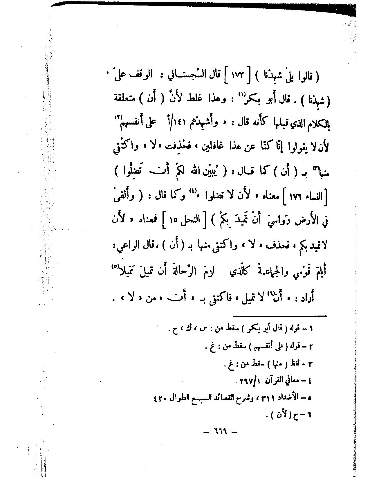 (قالوا بلى شهدنا) [173] قال السجستاني: ألوقف على (شهدنا). قال أبو بكر: وهذا غلط لأن (أن) متعلقة بالكلام الذي قبلها كأنه قال: «وأشهدهم على أنفسهم لأن لا يقولوا إنا كنا عن هذا غافلين» فحذفت «لا» واكتفي منها بـ «أن» كما قال: (يبين الله لكم أن تضلوا) [النساء: 176] معناه «لأن لا تضلوا» وكما قال: {وألقى في الأرض رواسي أن تميد بكم} [النحل: 15] فمعناه «لأن لا تميد بكم» فحذف (لا) واكتفى منها بـ (أن)، قال الراعي: