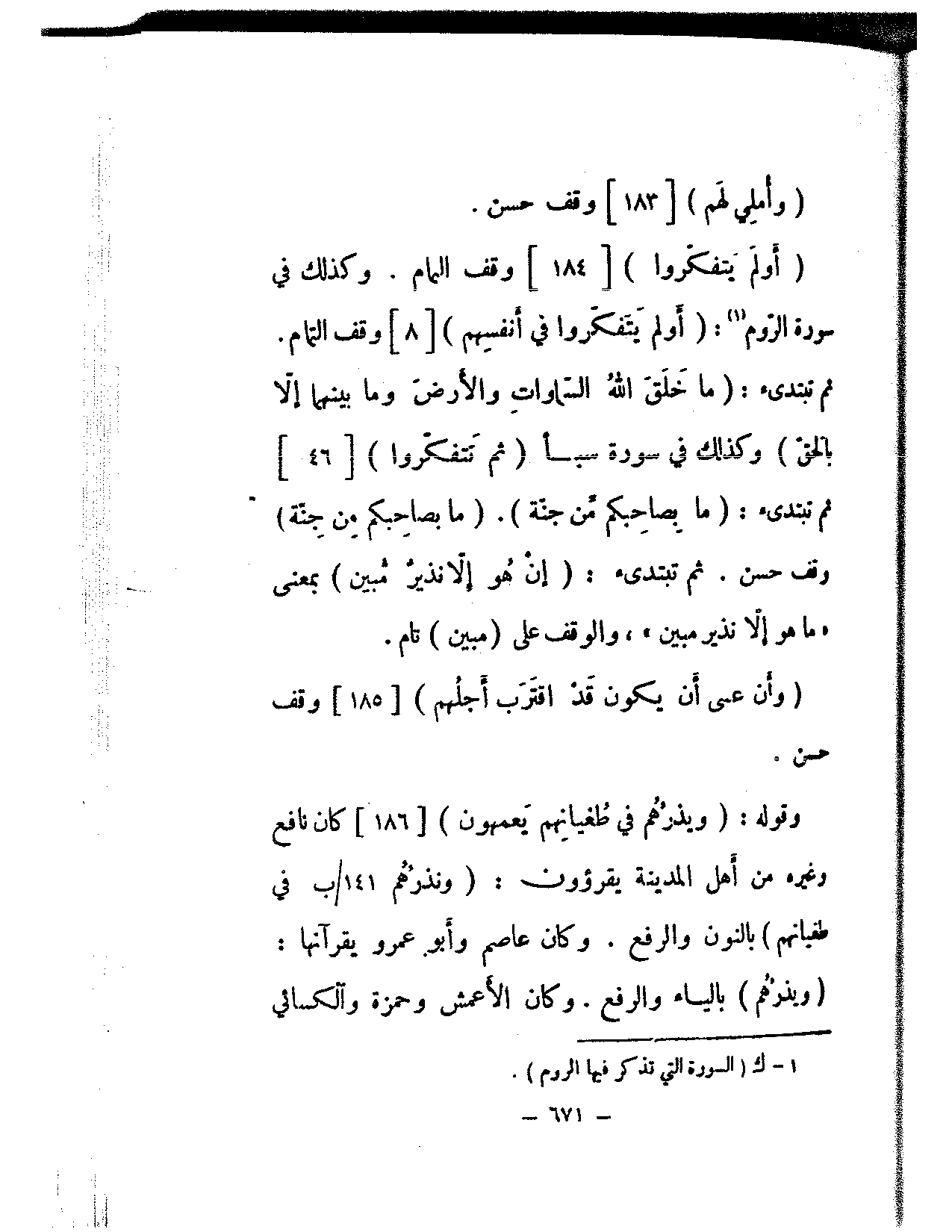(أولم يتفكروا) [184] وقف التمام. وكذلك في سورة الروم: (أولم يتفكروا في أنفسهم) [8] وقف التمام. ثم تتبديء: (ما خلق الله السماوات والأرض وما بينهما إلا بالحق) وكذلك في سورة سبأ (ثم تتفكروا) [46] ثم تبتدئ: (ما بصاحبكم من جنة). (ما بصاحبكم من جنة) وقف حسن. ثم تبتدئ: (إن هو إلا نذير مبين) بمعنى «ما هو إلا نذير مبين» والوقف على (مبين) تام.