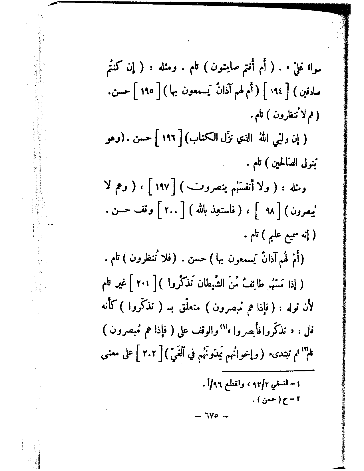 سواء علي». (أم أنتم صامتون) تام. ومثله: (إن كنتم صادقين) [194] (أم لهم آذان يسمعون بها) [195] حسن. (ثم لا تنظرون) تام.