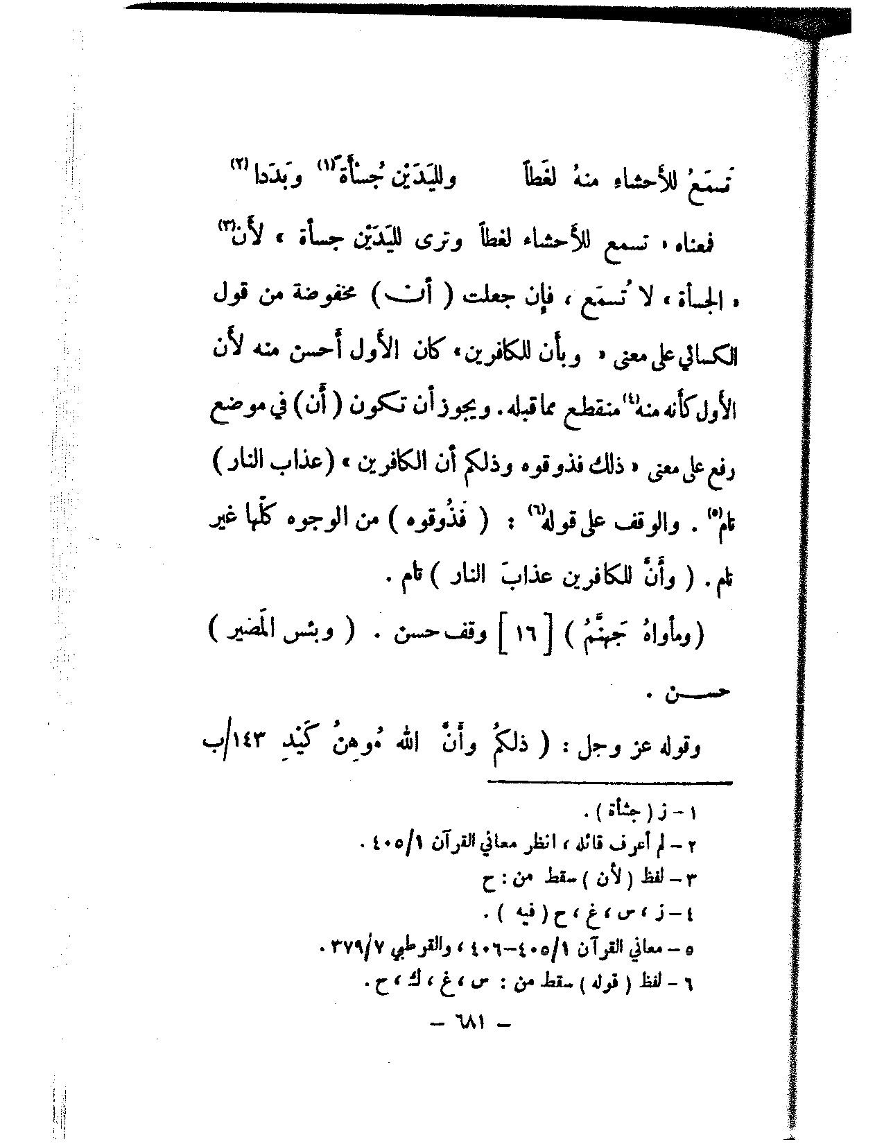 فمعناه: «تسمع للأحشاء لغطا وترى لليدين جسأة» لأن «الجسأة» لا تسمع، فإن جعلت (أن) مفخوضة من قول الكسائي على معنى «وبأن للكافرين» كان الأول أحسن منه لأن الأول كأنه منه منقطع مما قبله. ويجوز أن تكون (أن) في موضع رفع على معنى «ذلك فذوقوه وذلكم أن الكافرين» (عذاب النار) تام. والوقف على قوله: (فذوقوه) من الوجوه كلها غير تام. (وأن للكافرين عذاب النار) تام.