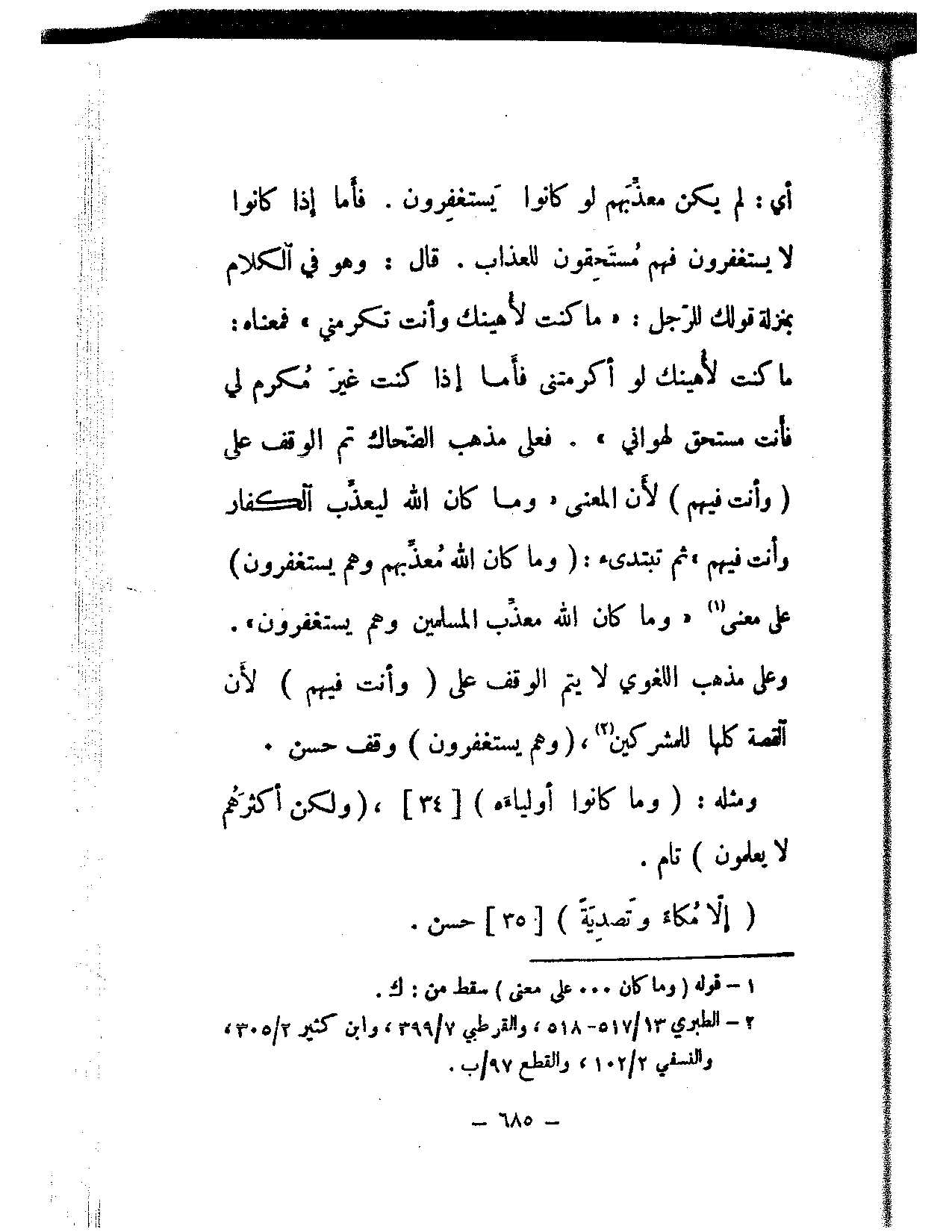 أي: لم يكن معذبهم لو كانوا يستغفرون. فأما إذا كانوا لا يستغفرون فهم مستحقون للعذاب. قال: وهو في الكلام بمنزلة قولك للرجل: «ما كنت لأهينك وأنت تكرمني» فمعناه: ما كنت لأهينك لوأكرمتني فأما إذا كنت غير مكرم لي فأنت مستحق لهواني. فعلى مذهب الضحاك تم الوقف على (وأنت فيهم) لأن المعنى «وما كان الله ليعذب الكفار وأنت فيهم» ثم تبتدئ: (وما كان الله معذبهم وهم يستغفرون) على معنى «وما كان الله معذب المسلمين وهم يستغفرون». وعلى مذهب اللغوي لا يتم الوقف على (وأنت فيهم) لأن القصة كلها للمشركين، (وهم يستغفرون) وقف حسن.