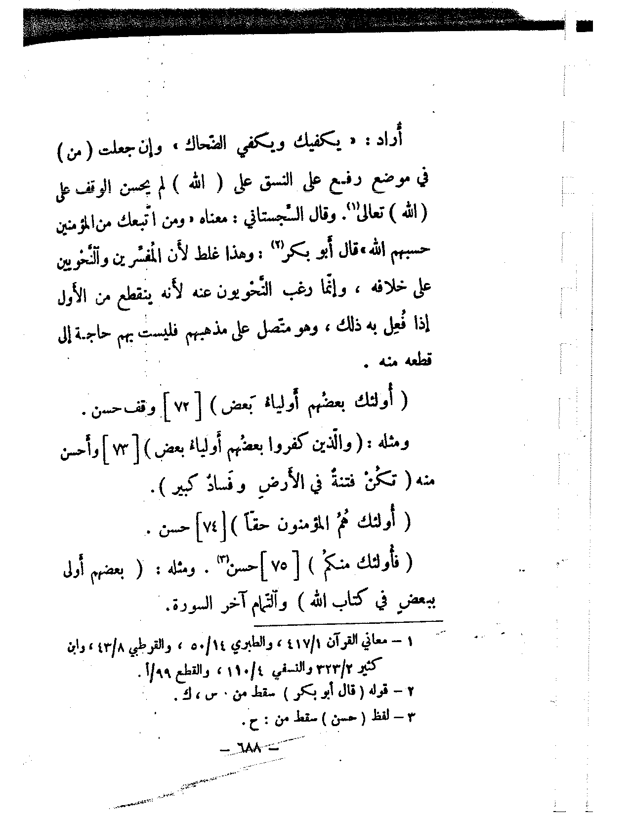 أراد: «يكفيك ويكفي الضحاك» وإن جعلت (من) في موضع رفع على النسق على (الله) لم يحسن الوقف على الله تعالى. وقال السجستاني: معناه «ومن اتبعك من المؤمنين حسبهم الله» قال أبو بكر: وهذا غلط لأن المفسرين والنحويين على خلافه، وإنما رغب النحويون عنه لأنه ينقطع من الأول إذا فعل به ذلك، وهو متصل على مذهبهم فليست بهم حاجة إلى قطعه منه.