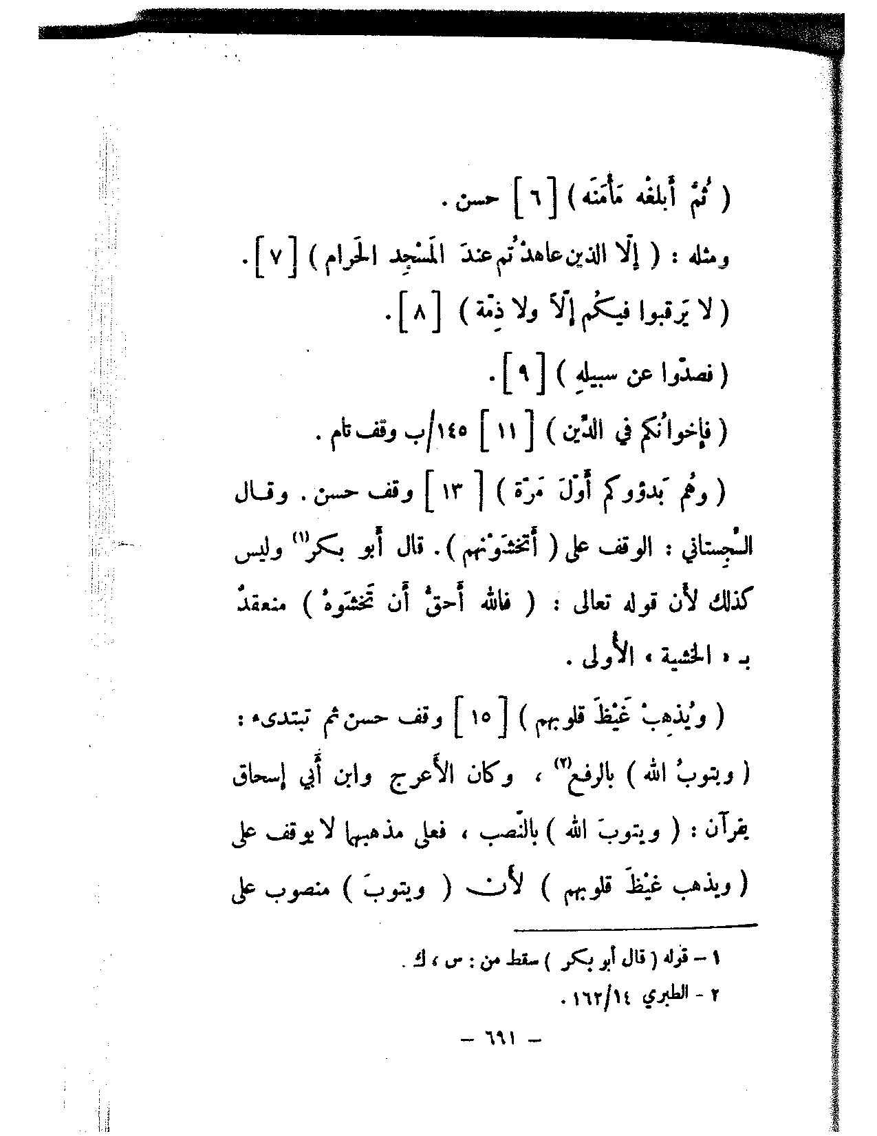(ويذهب غيظ قلوبهم) [15] وقف حسن ثم تبتدئ: (ويتوب الله) بالرفع، وكان الأعرج وابن أبي إسحاق يقرآن: (ويتوب الله) بالنصب، فعلى مذهبهما لا يوقف على (ويذهب غيظ قلوبهم) لأن (ويتوب) منصوب على