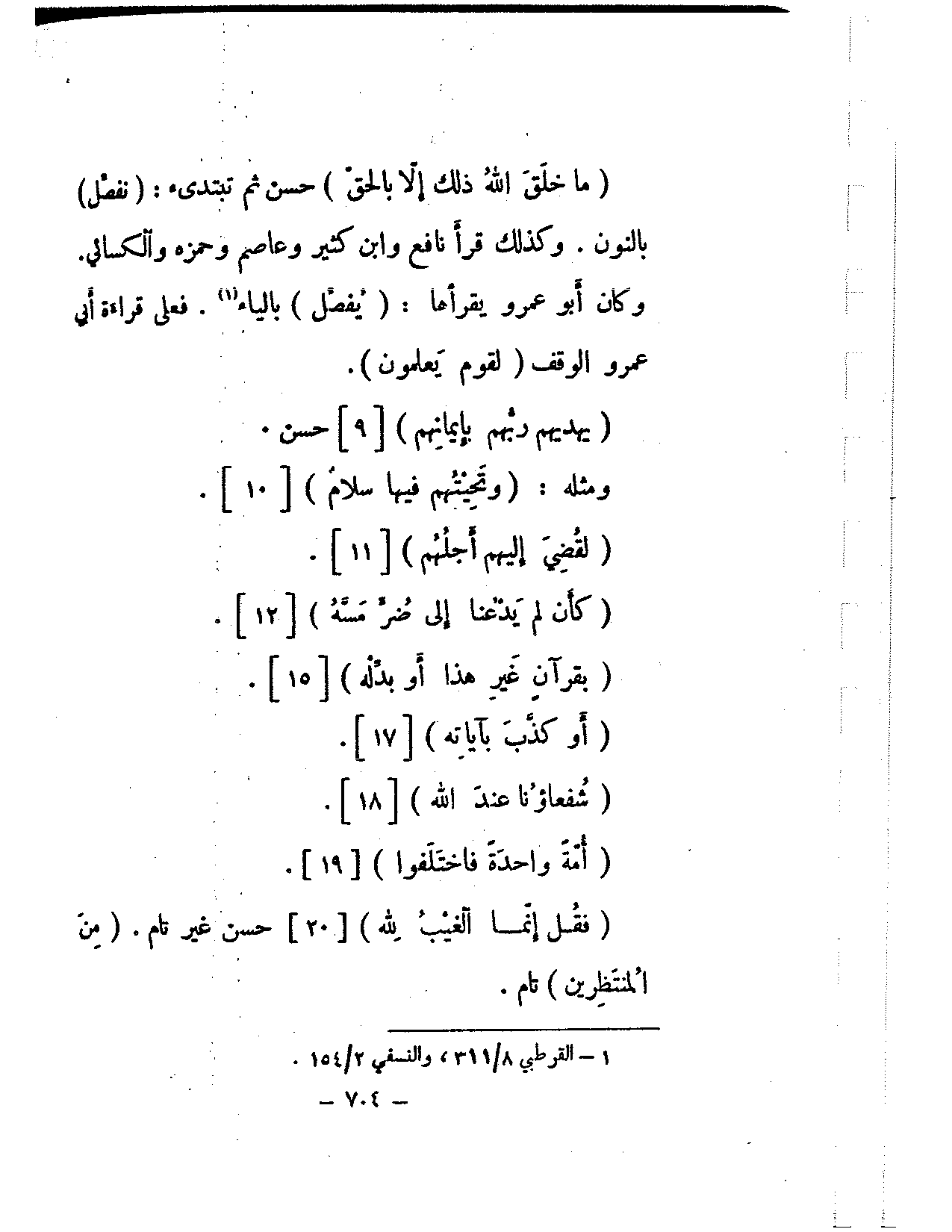 (ما خلق الله ذلك إلا بالحق) حسن ثم تبتدئ: (نفصل) بالنون. وكذلك قرأ نافع وابن كثير وعاصم وحمزة والكسائي. وكان أبو عمرو يقرأها: (يفصل) بالياء. فعلى قراءة أبي عمرو الوقف (لقوم يعلمون).