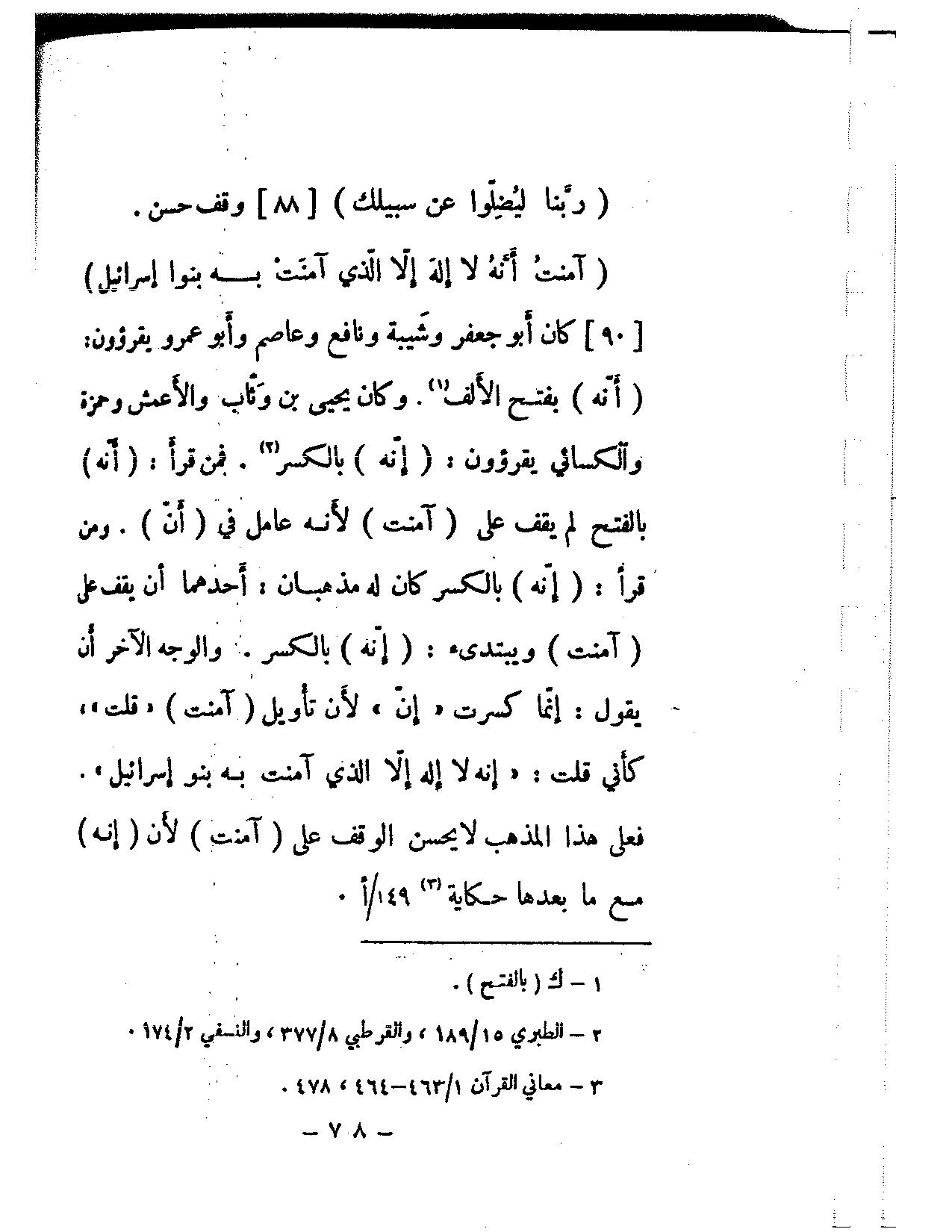 (آمنت أنه لا إله إلا الذي آمنت به بنوا إسرائيل) [90] كان أبو جعفر وشيبة ونافع وعاصم وأبو عمرو يقرؤون: (أنه) بفتح الألف. وكان يحيى بن وثاب والأعمش وحمزة والكسائي يقرؤون: (إنه) بالكسر. فمن قرأ: (أنه) بالفتح لم يقف على (آمنت) لأنه عامل في (أن). ومن قرأ: (إنه) بالكسر كان له مذهبان: أحدهما أن يقف على (آمنت) ويبتديء: (إنه) بالكسر. والوجه الآخر أن يقول: إنما كسرت «إن» لأن تأويل (آمنت) «قلت»، كأني قلت: «إنه لا إله إلا الذي آمنت به بنو إسرائيل». فعلى هذا المذهب لا يحسن الوقف على (آمنت) لأن (إنه) ما بعدها حكاية.