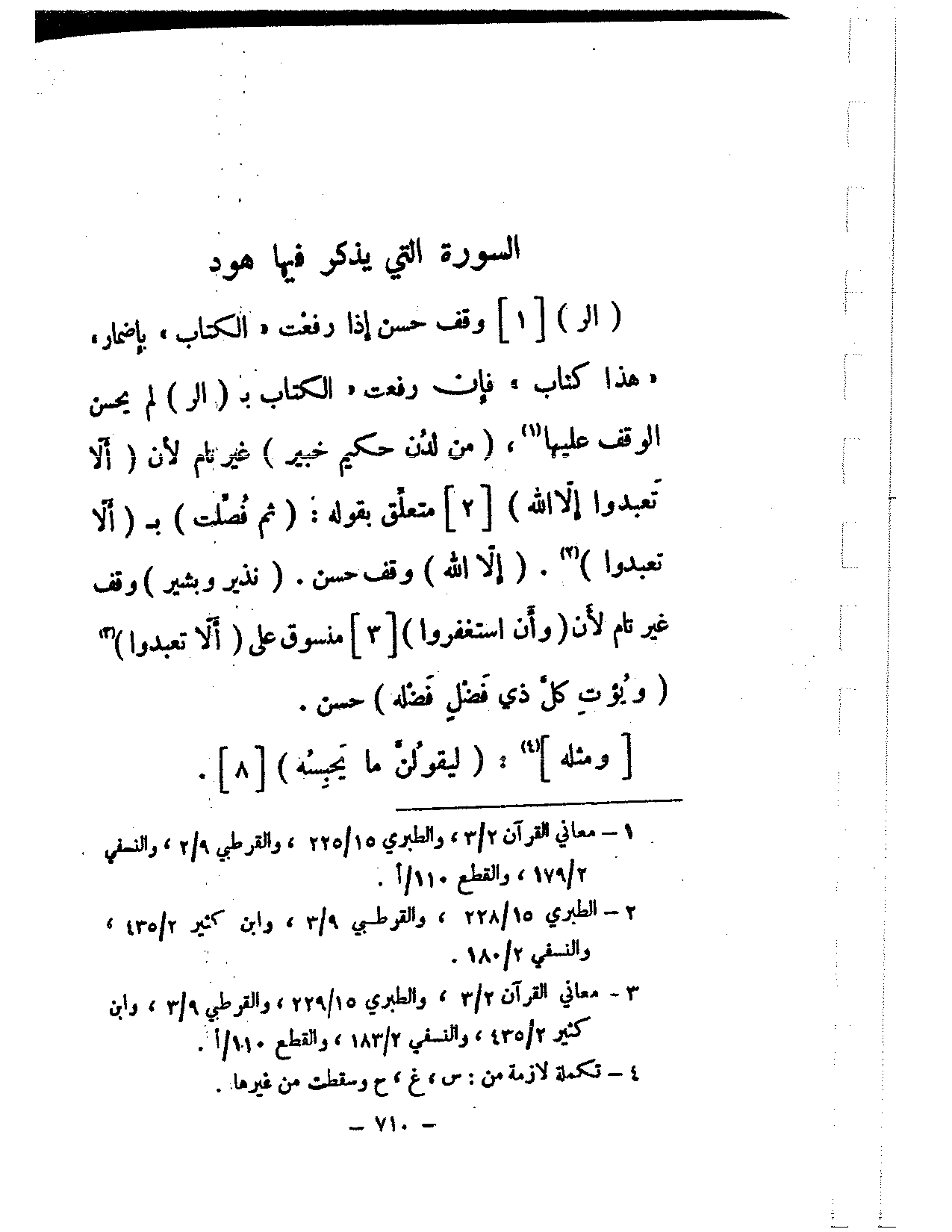 (الر) [1] وقف حسن إذا رفعت «الكتاب» بإضمار «هذا كتاب» فإن رفعت «الكتاب بـ (الر) لم يحسن الوقف عليها، (من لدن حكيم خبير) غير تام لأن (ألا تعبدوا إلا الله) [2] متعلق بقوله: (ثم فصلت) بـ (ألا تعبدوا). (إلا الله) وقف حسن. (نذير وبشير) وقف غير تام لأن (وأن استغفروا) [3] منسوق على (ألا تعبدوا) (ويؤت كل ذي فضل فضله) حسن».