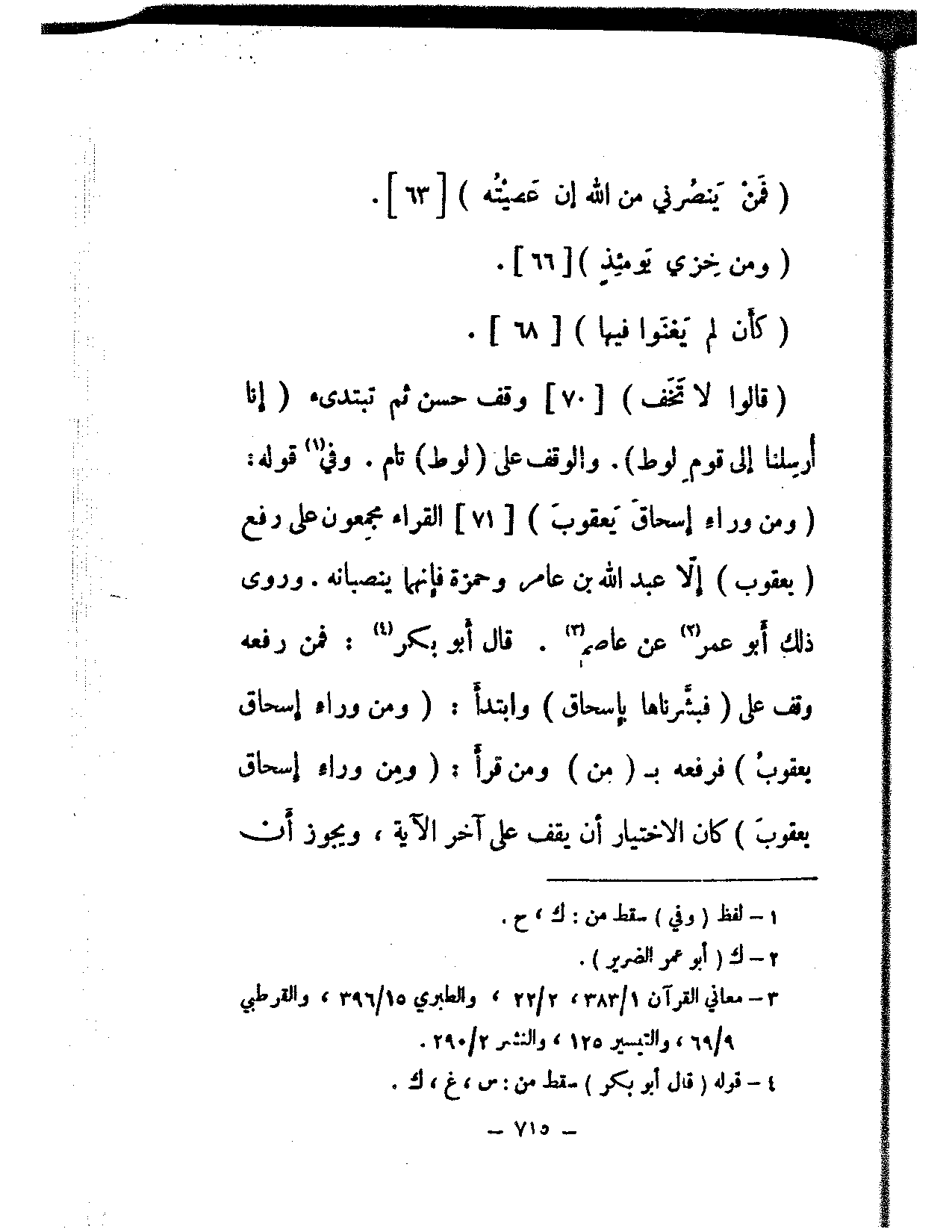 (قالوا لا تخف) [70] وقف حسن ثم تبتدئ (إنا أرسلنا إلى قوم لوط) والوقف على (لوط) تام. وفي قوله: (ومن وراء إسحاق يعقوب) [71] القراء مجمعون على رفع (يعقوب) إلا عبد الله بن عامر وحمزة فإنهما ينصبانه. وروى ذلك أبو عمرو عن عاصم. قال أبو بكر: فمن رفعه وقف على (فبشرناها بإسحاق) وابتدأ: (ومن وراء إسحاق يعقوب) كان الاختيار أن يقف على آخر الآية، ويجوز أن