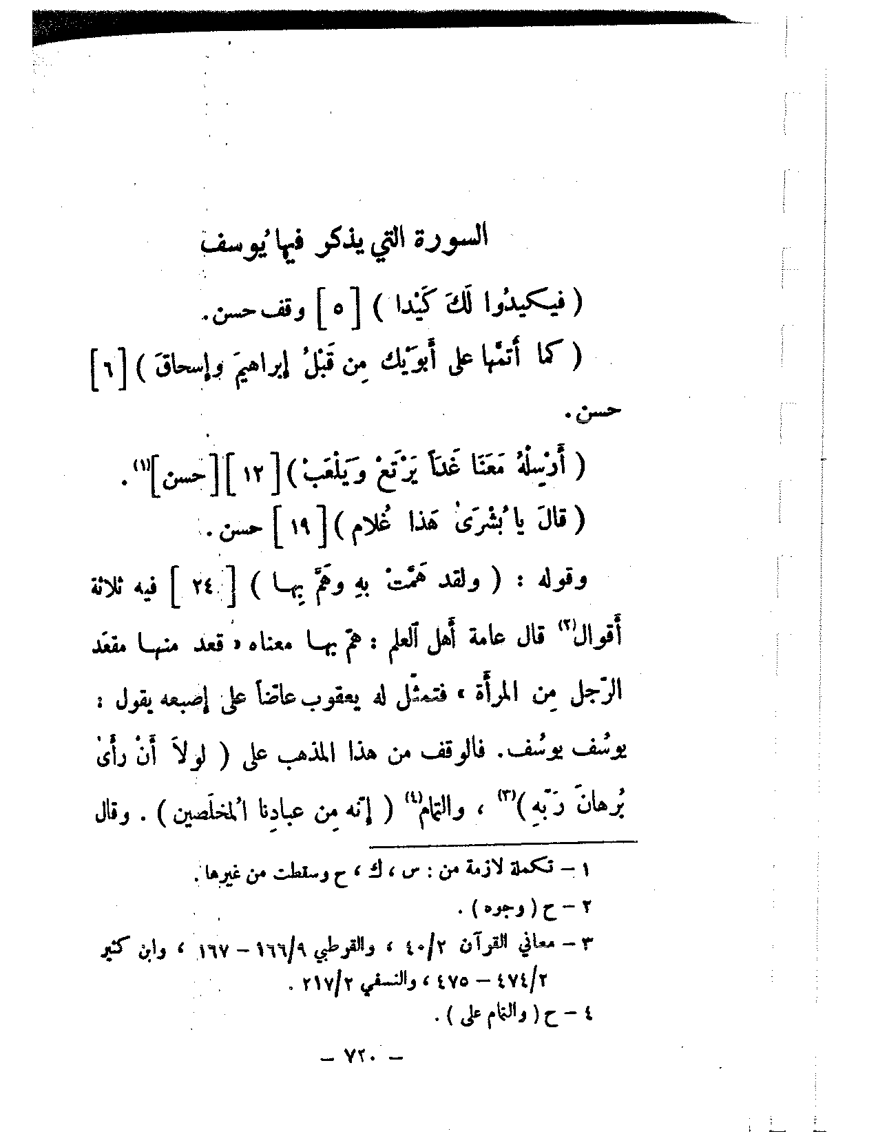 وقوله: (ولقد همت به وهم بها) [24] فيه ثلاثة أقوال قال عامة أهل العلم: هم بها معناه «قعد منها مقعد الرجل من المرأة» فتمثل له يعقوب عاضًا على إصبعه يقول: يوسف يوسف. فالوقف من هذا المذهب على (لولا أن رأى برهان ربه)، والتمام (إنه من عبادنا المخلصين). وقال