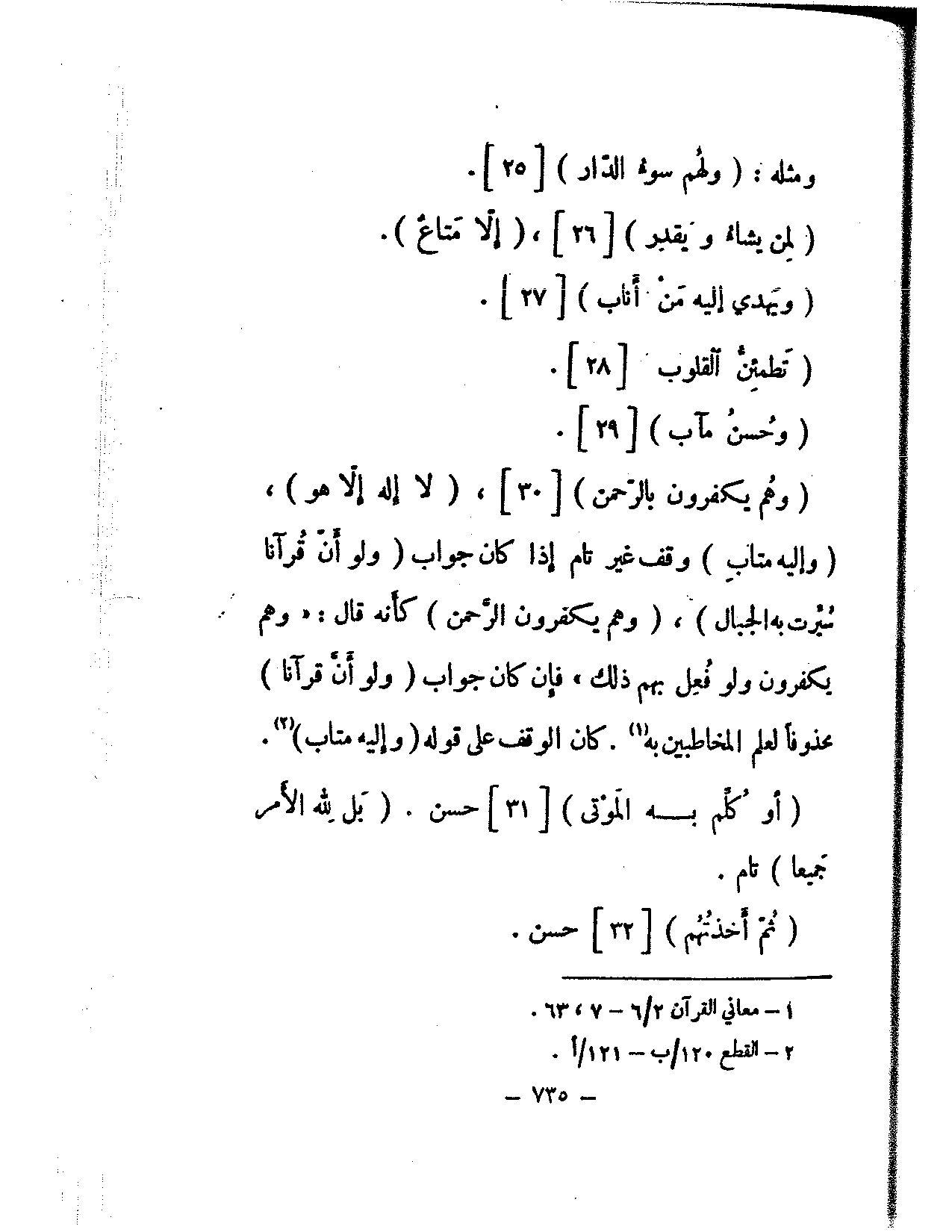 (وهم يكفرون بالرحمن) [30]، (لا إله إلا هو)، (وإليه متاب) وقف غير تام إذا كان جواب (ولو أن قرآنا سيرت به الجبال)، (وهم يكفرون الرحمن) كأنه قال: «وهم يكفرون ولو فعل بهم ذلك» فإن كان جواب (ولو أن قرآنا) محذوفًا لعلم المخاطبين به. كان الوقف على قوله (وإليه متاب).