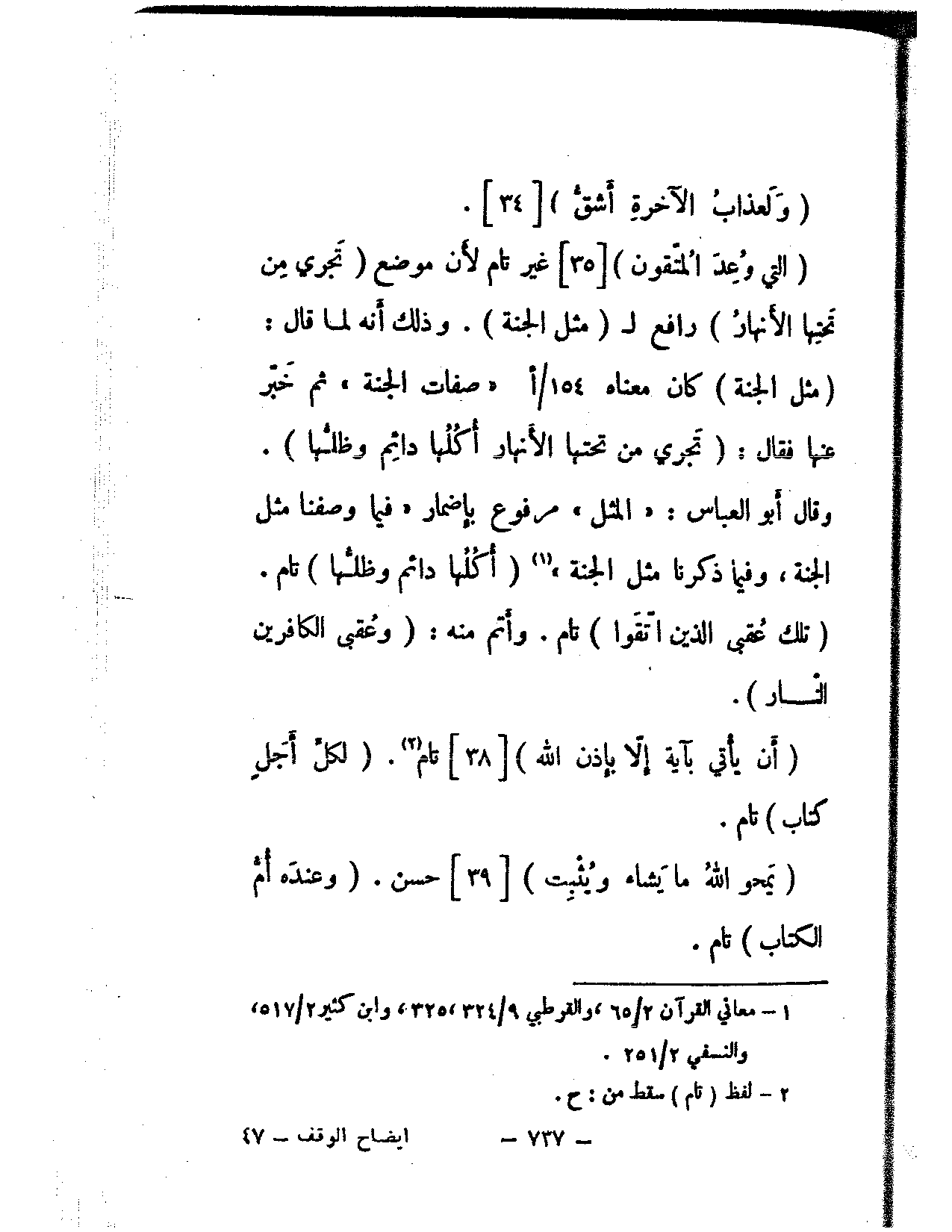 (التي وعد المتقون) [35] غير تام لأن موضع (تجري من تحتها الأنهار) رافع لـ (مثل الجنة). وذلك أنه لما قال: (مثل الجنة) كان معناه «صفات الجنة» ثم خبر عنها فقال: (تجري من تحتها الأنهار أكلها دائم وظلها). وقال أبو العباس: «المثل» مرفوع بإضمار «فيما وصفنا مثل الجنة، وفيما ذكرنا مثل الجنة» (أكلها دائم وظلها) تام. (تلك عقبى الذين اتقوا) تام. وأتم منه: (وعقبى الكافرين النار).