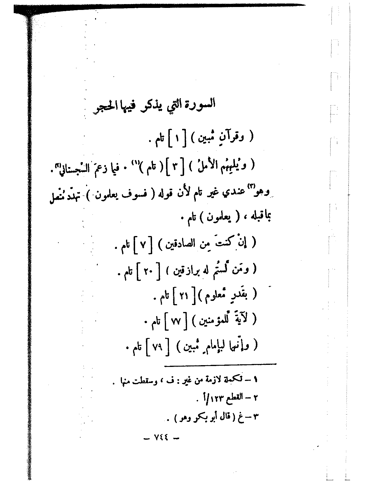 (ويلههم الأمل) [3] (تام). فيما زعم السجستاني. وهو عندي غير تام لأن قوله (فسوف يعلمون) تهدد متصل بما قبله، (يعلمون) تام.