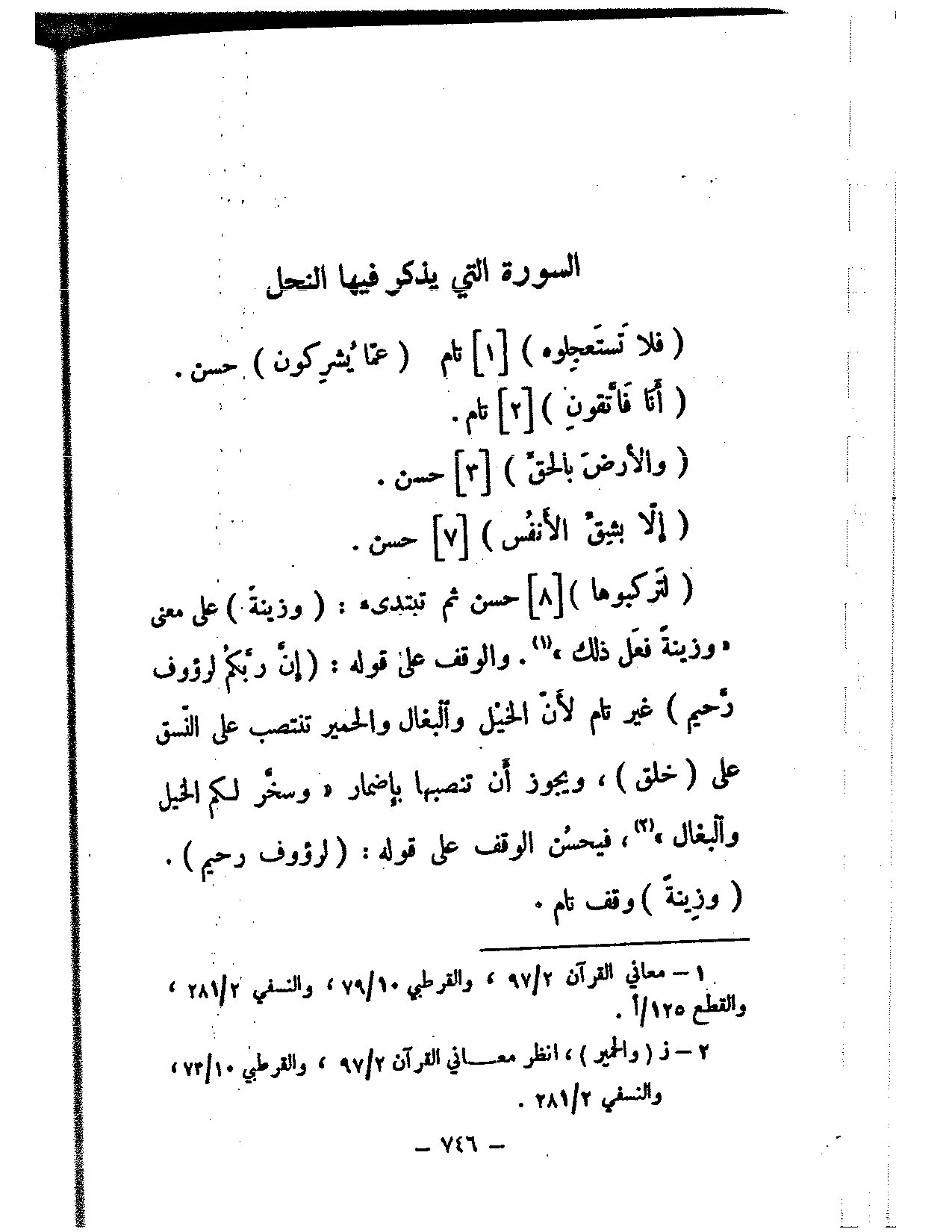 (لتركبوها) [8] حسن ثم تبتدئ: (وزينة) على معنى «وزينة فعل ذلك». والوقف على قوله: (إن ربكم لرؤوف رحيم) غير تام لأن الخيل والبغال والحمير تنتصب على النسق على (خلق)، ويجوز أن تنصبها بإضمار «وسخر لكم الخيل والبغال»، فيحسن الوقف على قوله: (لرؤوف رحيم). (وزينة) وقف تام.