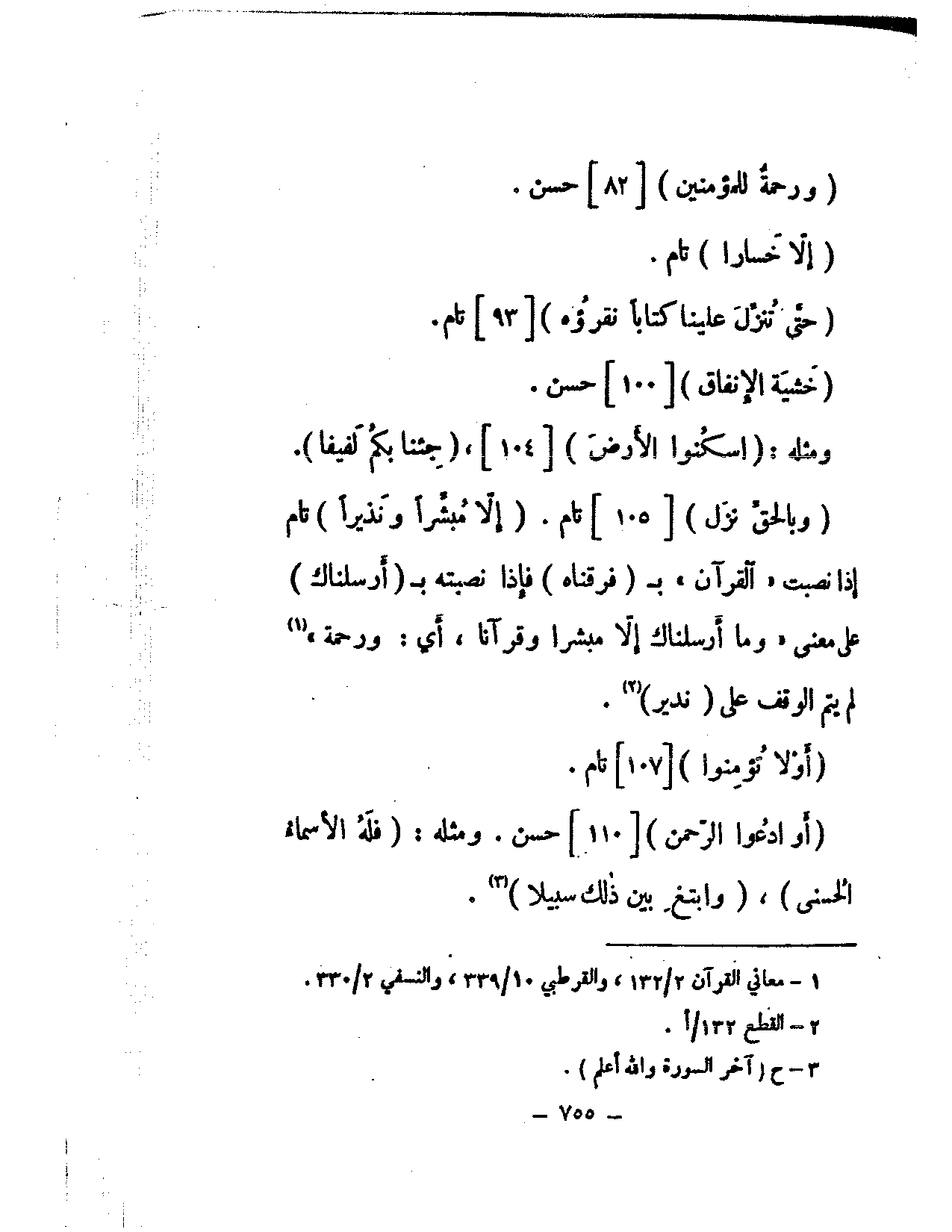 (وبالحق نزل) [105] تام. (إلا مبشرا ونذيرا) تام إذا نصب «القرآن» بـ «فرقناه» فإذا نصبته بـ (أرسلناك) على معنى «وما أرسلناك إلا مبشرا وقرآنا، أي: ورحمة» لم يتم الوقف على (ندير).
