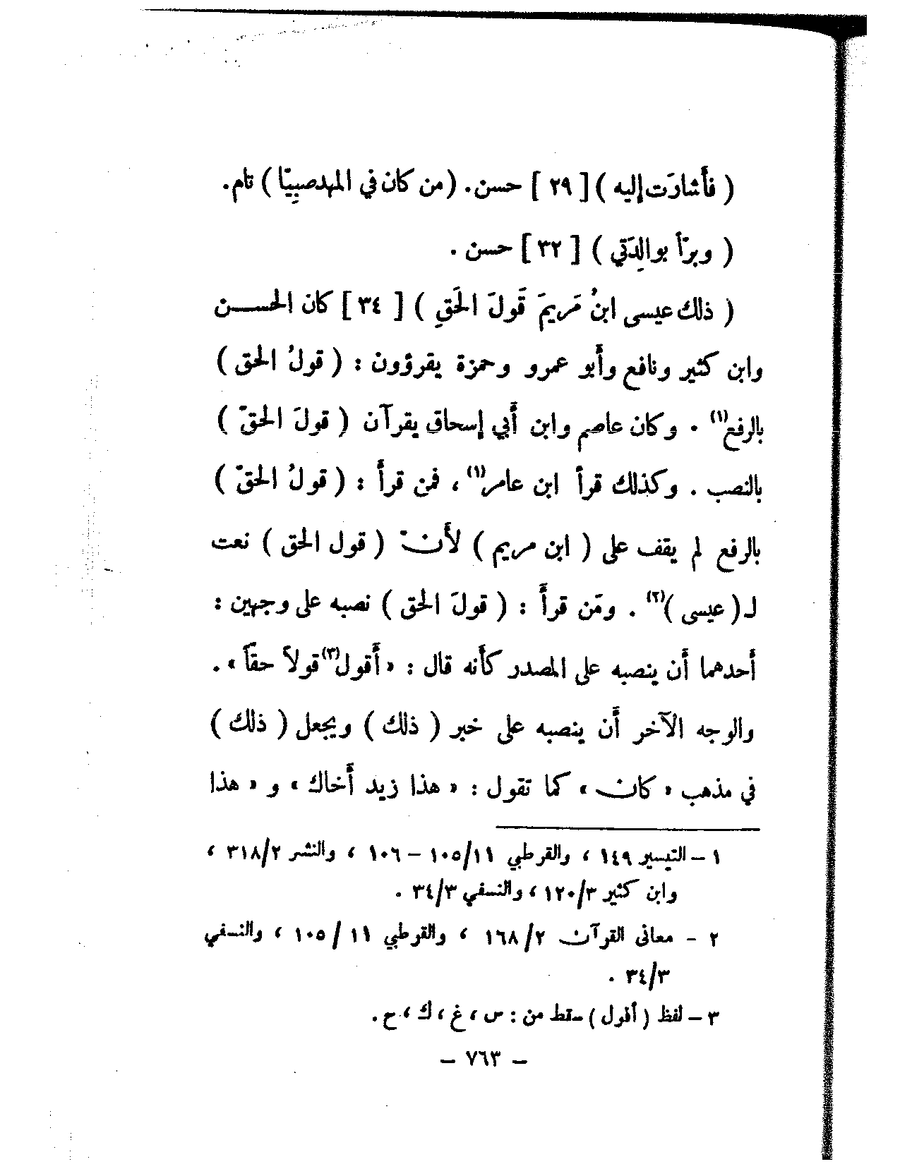 (ذلك عيسى ابن مريم قول الحق) [34] كان الحسن وابن كثير ونافع وأبو عمرو وحمزة يقرؤون: (قول الحق) بالرفع. وكان عاصم وابن أبي إسحاق يقرآن (قول الحق) بالنصب. وكذلك قرأ ابن عامر، فمن قرأ (قول الحق) بالرفع لم يقف على (ابن مريم) لأن (قول الحق) نعت لـ (عيسى). ومن قرأ: (قول الحق) نصبه على وجهين: أحدهما أن ينصبه على المصدر كأنه قال: «أقول قولا حقا». والوجه الآخر أن ينصبه على خبر (ذلك) ويجعل (ذلك) في مذهب «كان» كما تقول: «هذا زيد أخاك» و «هذا