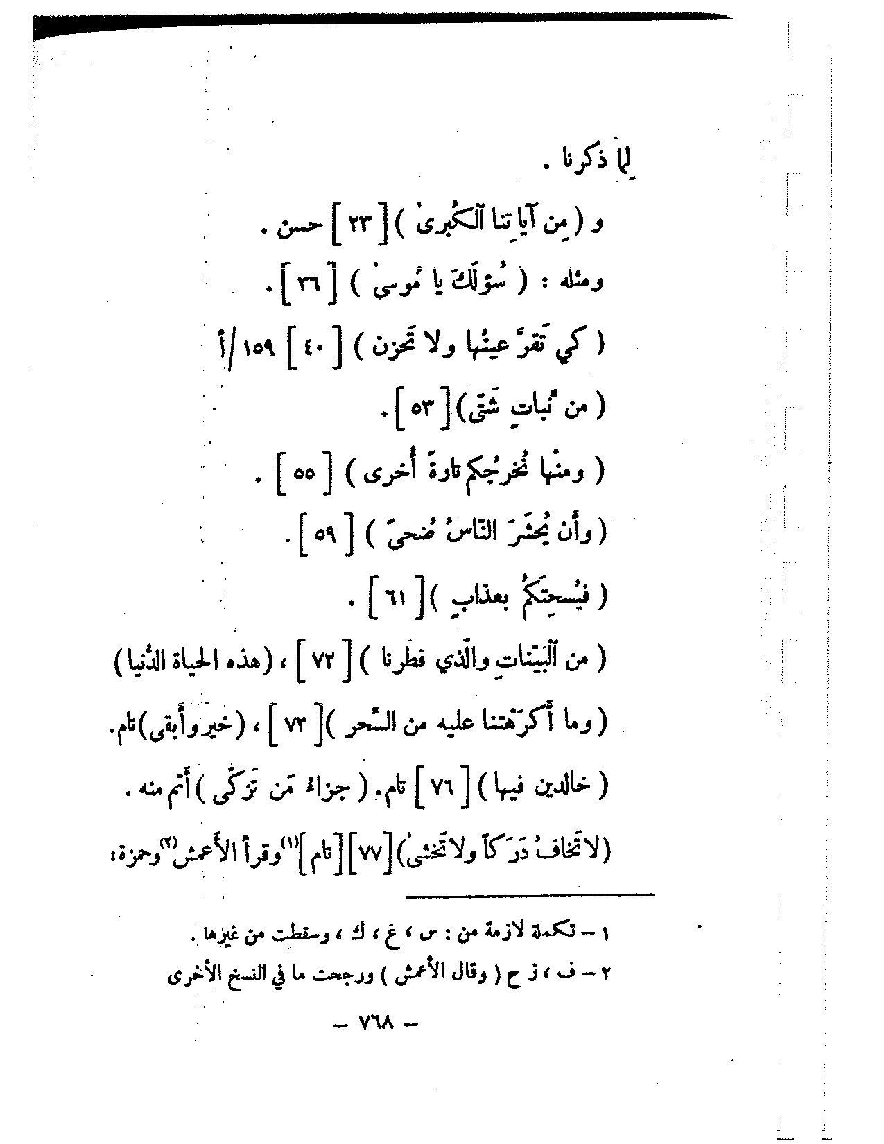 (من البينات والذي فطرنا) [72]، (هذه الحياة الدنيا) (وما أكرهتنا عليه من السحر) [73]، (خير وأبقى) تام.