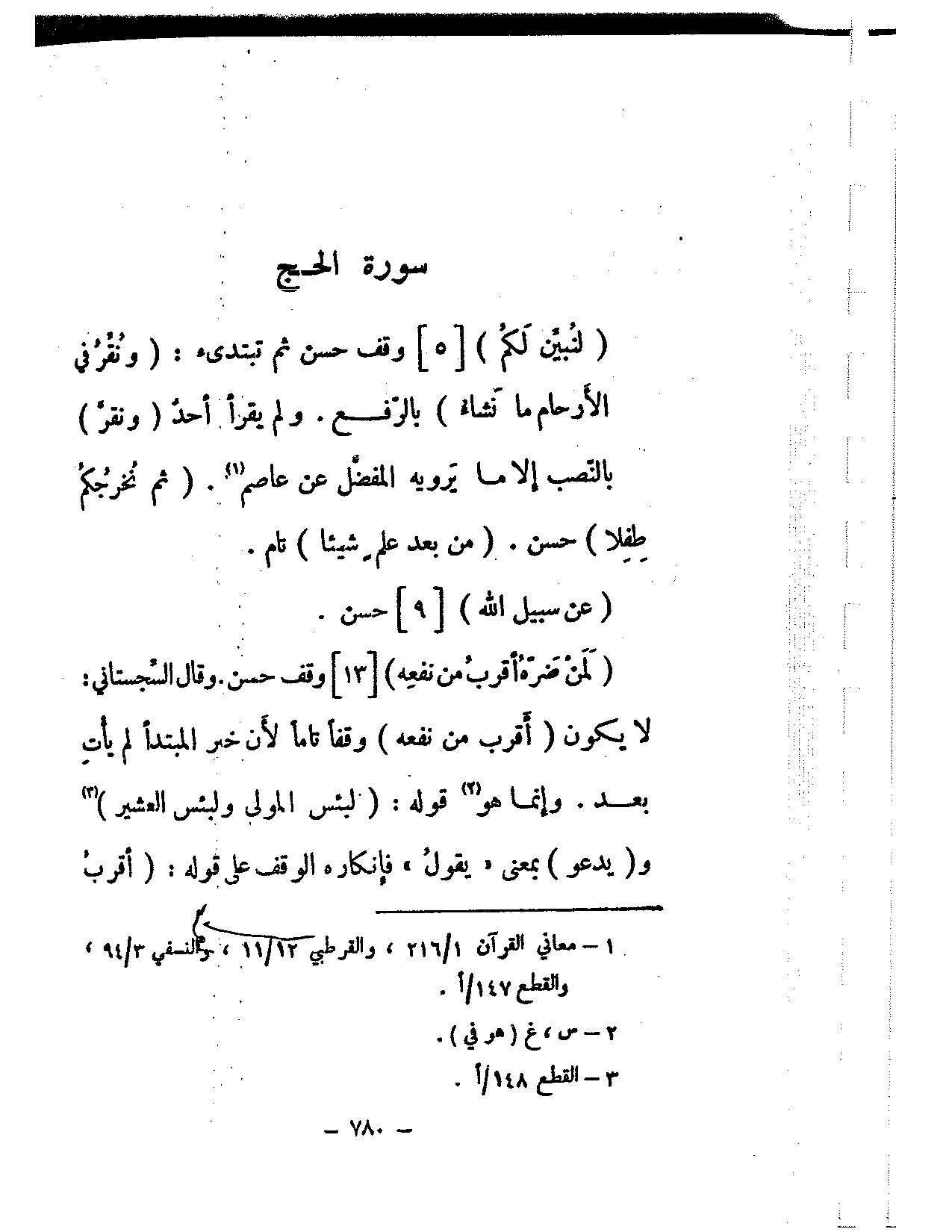 (لمن ضره أقرب من نفعه) [13] وقف حسن. وقال السجستاني: لا يكون (أقرب من نفعه) وقفًا تامًا لأن خبر المبتدأ لم يأت بعد. وإنما هو قوله: (لبئس المولى ولبئس العشير) و (يدعو) بمعنى «يقول» فإنكاره الوقف على قوله: (أقرب