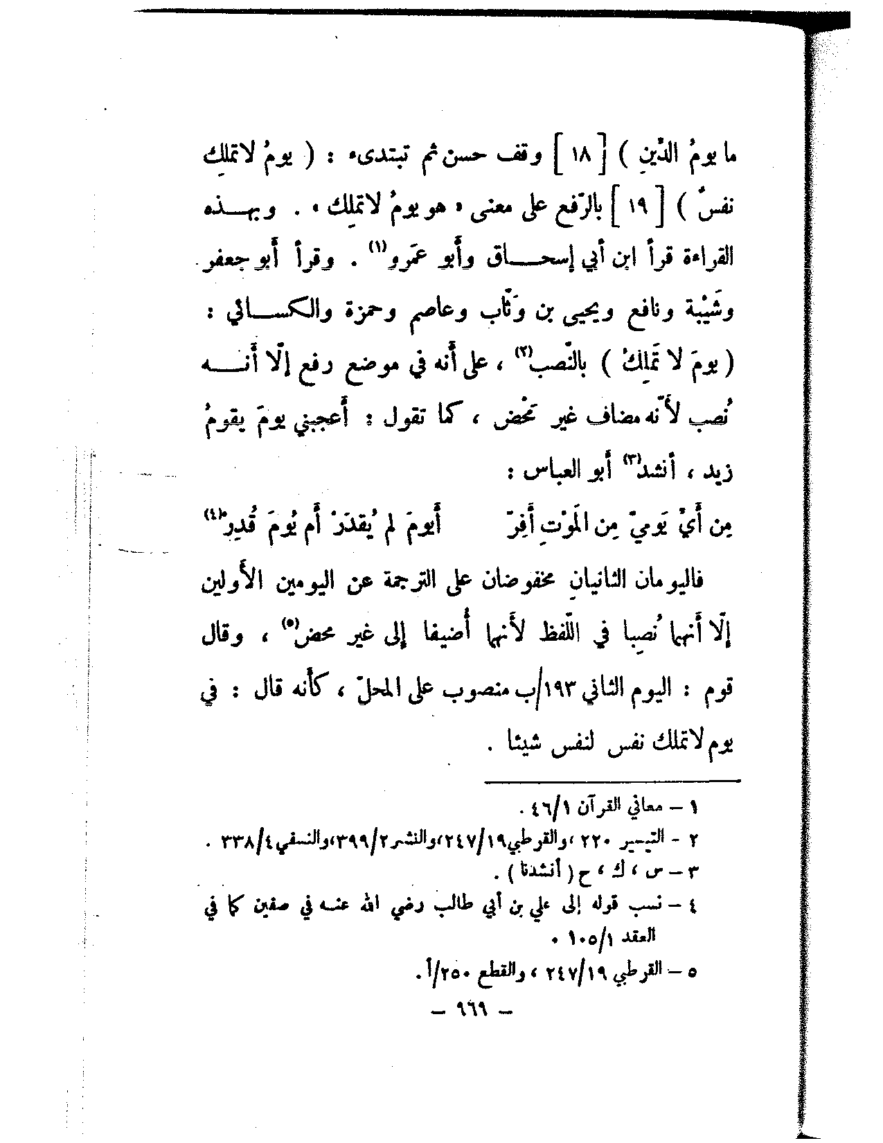 ما يوم الدين) [18] وقف حسن ثم تبتدئ: (يوم لا تملك نفس) [19] بالرفع على معنى «هو يوم لا تملك». وبهذه القراءة قرأ ابن أبي إسحاق وأبو عمرو. وقرأ أبو جعفر وشيبة ونافع ويحيى بن وثاب وعاصم وحمزة والكسائي: (يوم لا تملك) بالنصب، على أنه في موضع رفع إلا أنه نصب لأنه مضاف غير محض، كما تقول: أعجبني يوم يقوم زيد، أنشد أبو العباس:
