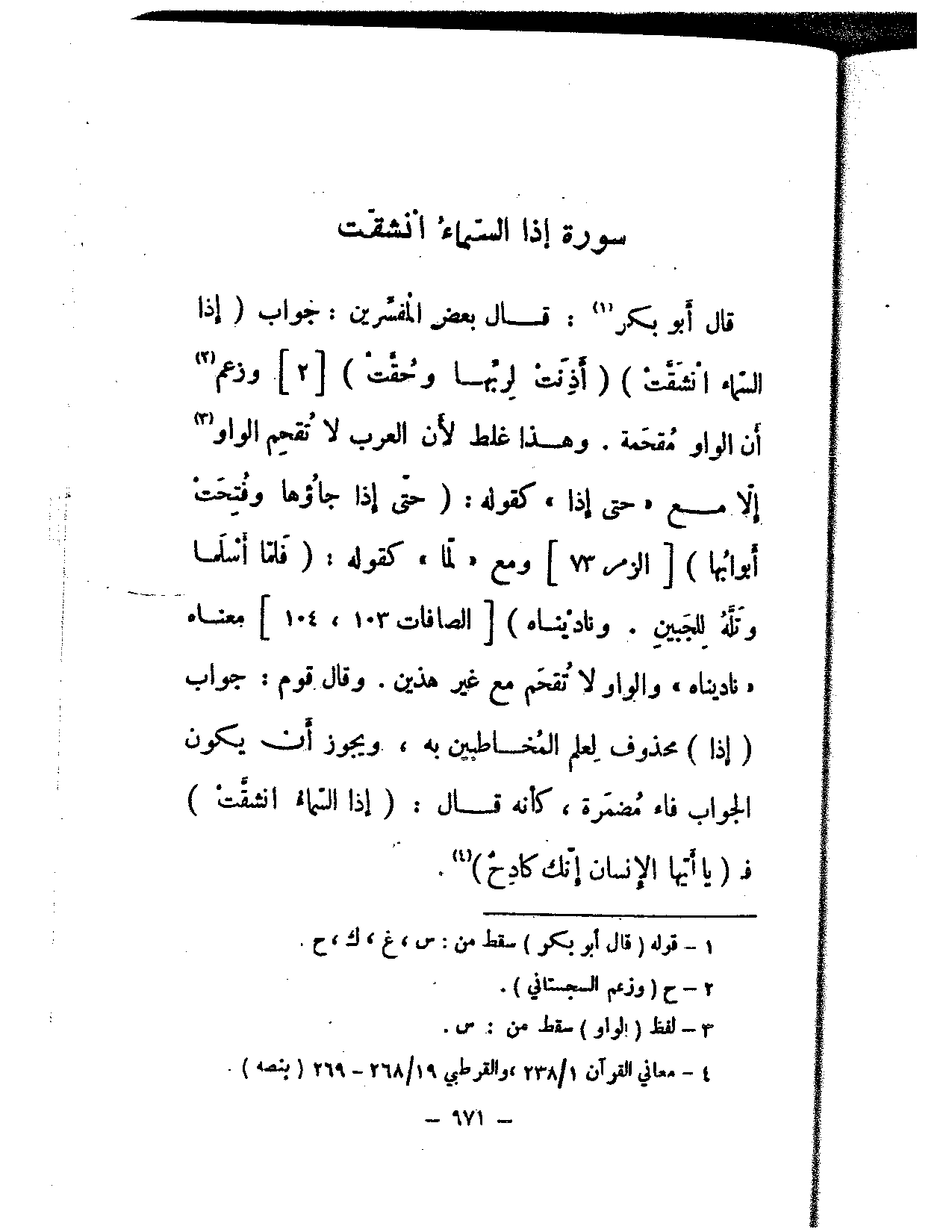 قال أبو بكر: قال بعض المفسرين: جواب (إذا السماء انشقت) (أذنت لربها وحقت) [2] وزعم أن الواو مقحمة. وهذا غلط لأن العرب لا تقحم الواو إلا مع «حتى إذا» كقوله: {حتى إذا جاؤها وفتحت أبوابها} [الزمر: 73] ومع «لما» كقوله: {فلما أسلما وتله للجبين. وناديناه} [الصافات: 103، 104] معناه «ناديناه» والواو لا تقحم مع غير هذين. وقال قوم: جواب (إذا) محذوف لعلم المخاطبين به، ويجوز أن يكون الجواب فاء مضمرة، كأنه قال: (إذا السماء انشقت) فـ (يا أيها الإنسان إنك كادح).