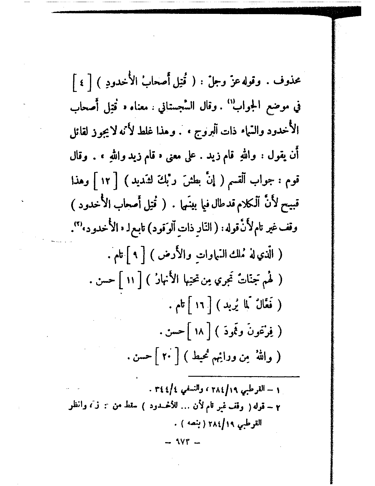 محذوف. وقوله عز وجل: (قتل أصحاب الأخدود) [4] في موضع الجواب. وقال السجستاني: معناه «قتل أصحاب الأخدود والسماء ذات البروج». وهذا غلط لأنه لا يجوز لقائل أن يقول: والله قام زيد. على معنى «قام زيد والله». وقال قوم: جواب القسم (إن بطش ربك لشديد) [12] وهذا قبيح لأن الكلام قد طال فيما بينهما. (قتل أصحاب الأخدود) وقف غير تام لأن قوله: (النار ذات الوقود) تابع لـ «الأخدود».