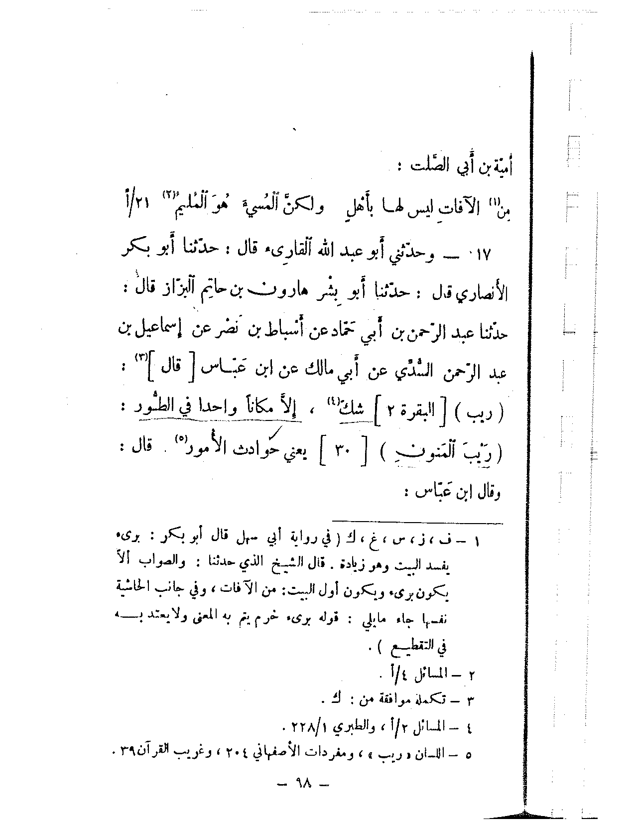 117 - وحدثني أبو عبد الله القارئ قال: حدثنا أبو بكر الأنصاري قال: حدثنا أبو بشر هارون بن حاتم البزاز قال: حدثنا عبد الرحمن بن أبي حماد عن أسباط بن نصر عن إسماعيل بن عبد الرحمن السدي عن أبي مالك عن ابن عباس [قال]: {ريب} [البقرة: 2] شك، إلا مكانا واحدًا في الطور: {ريب المنون} [30] يعني حوادث المور. قال: وقال ابن عباس:
