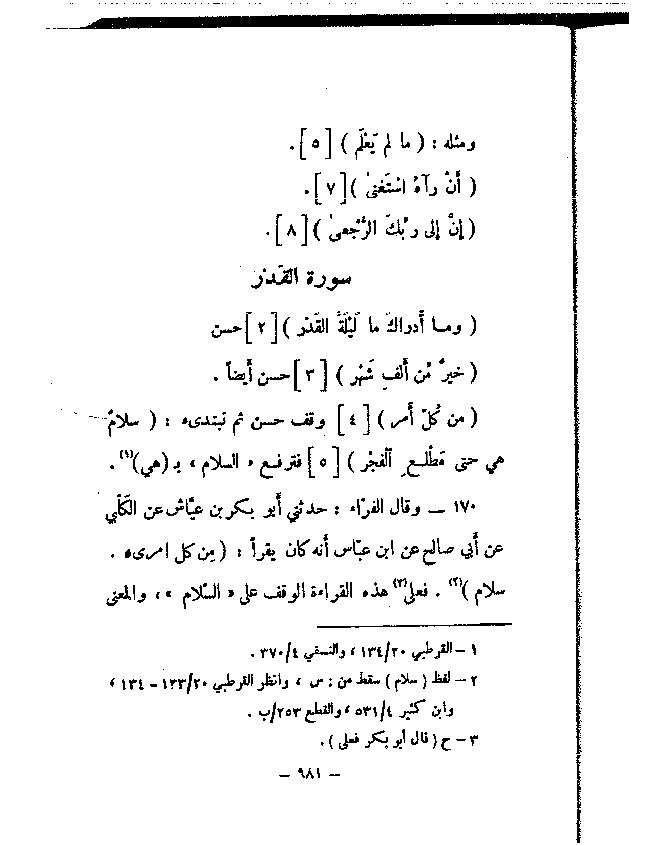 170 - وقال الفراء: حدثني أبو بكر بن عياش عن الكلبي عن أبي صالح عن ابن عباس أنه كان يقرأ: (من كل امرئ. سلام). فعلى هذه القراءة الوقف على «السلام»، والمعنى