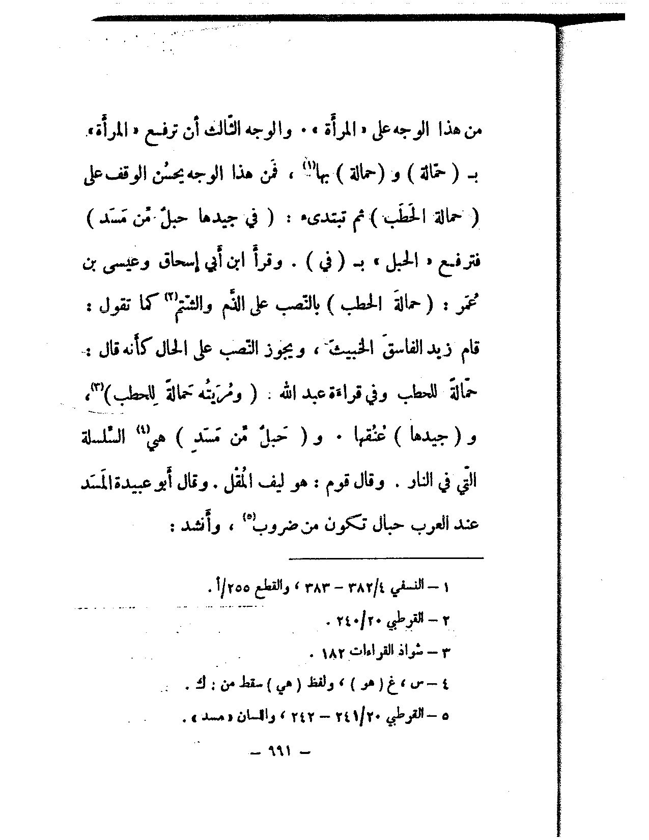 من هذا الوجه على «المرأة». والوجه الثالث أن ترفع «المرأة» بـ (حمالة) و (حمالة) بها، فمن هذا الوجه يحسن الوقف على (حمالة الحطب) ثم تبتدئ: (في جيدها حبل من مسد) فترفع «الحبل» بـ (في). وقرأ ابن أبي إسحاق وعيسى بن عمر: (حمالة الحطب) بالنصب على الذم والشتم كما تقول: قام زيد الفاسق الخبيث، ويجوز النصب على الحال كأنه قال: حمالة للحطب وفي قراءة عبد الله: (ومريته حمالة للحطب)، و (جيدها) عنقها. و (حبل من مسد) هي السلسلة التي في النار. وقال قوم: هو ليف المقل. وقال أبو عبيدة المسد عند العرب حبال تكون من ضروب، وأنشد: