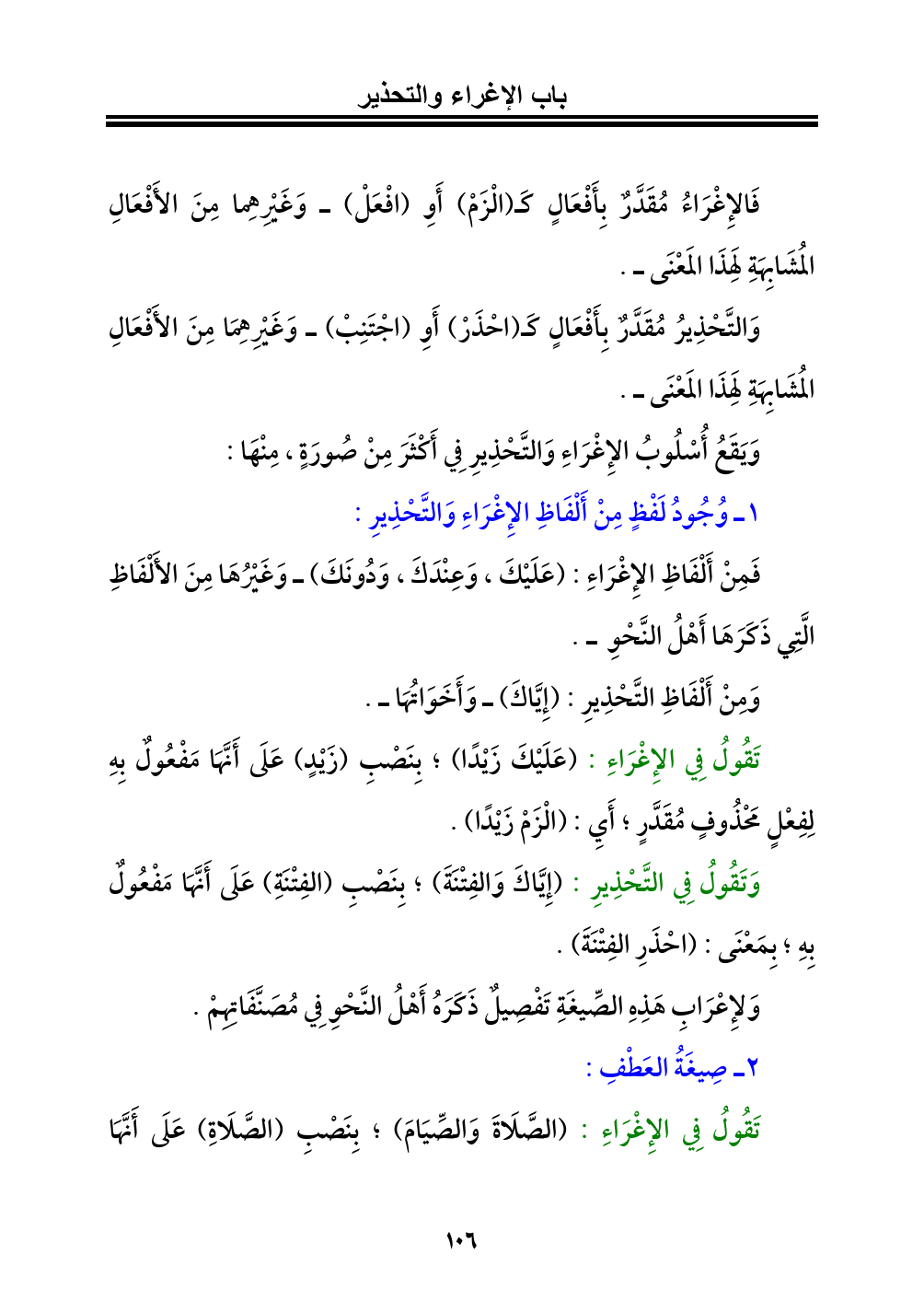 تَقُولُ فِي الإِغْرَاءِ: (الصَّلَاةَ وَالصِّيَامَ)؛ بِنَصْبِ (الصَّلَاةِ) عَلَى أَنَّهَا