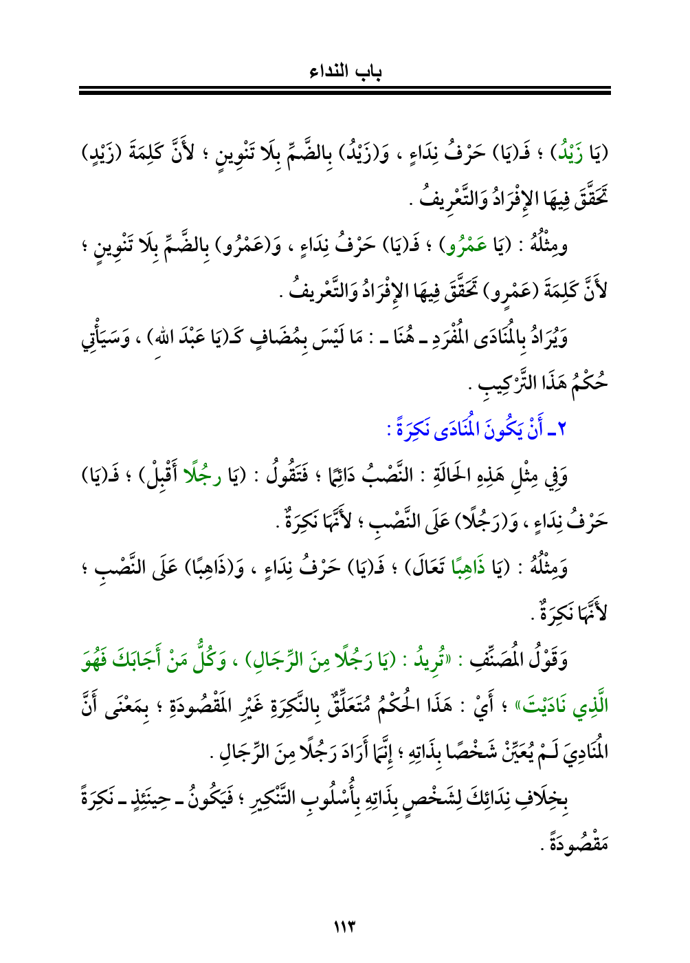 (يَا زَيْدُ)؛ فَـ (يَا) حَرْفُ نِدَاءٍ، وَ (زَيْدُ) بِالضَّمِّ بِلَا تَنْوِينٍ؛ لأَنَّ كَلِمَةَ (زَيْدٍ) تَحَقَّقَ فِيهَا الإِفْرَادُ وَالتَّعْرِيفُ.