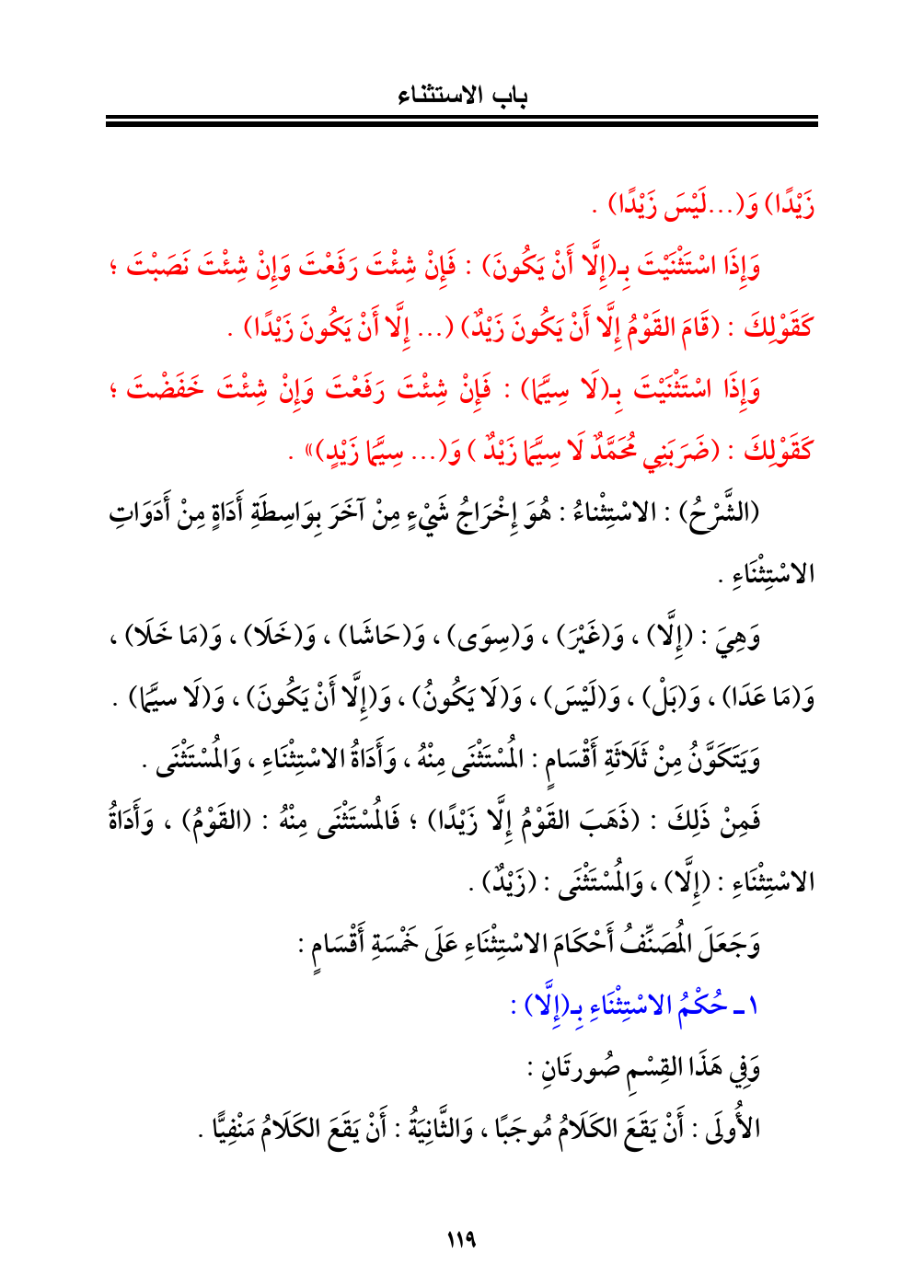 وَجَعَلَ المُصَنِّفُ أَحْكَامَ الاسْتِثْنَاءِ عَلَى خَمْسَةِ أَقْسَامٍ: