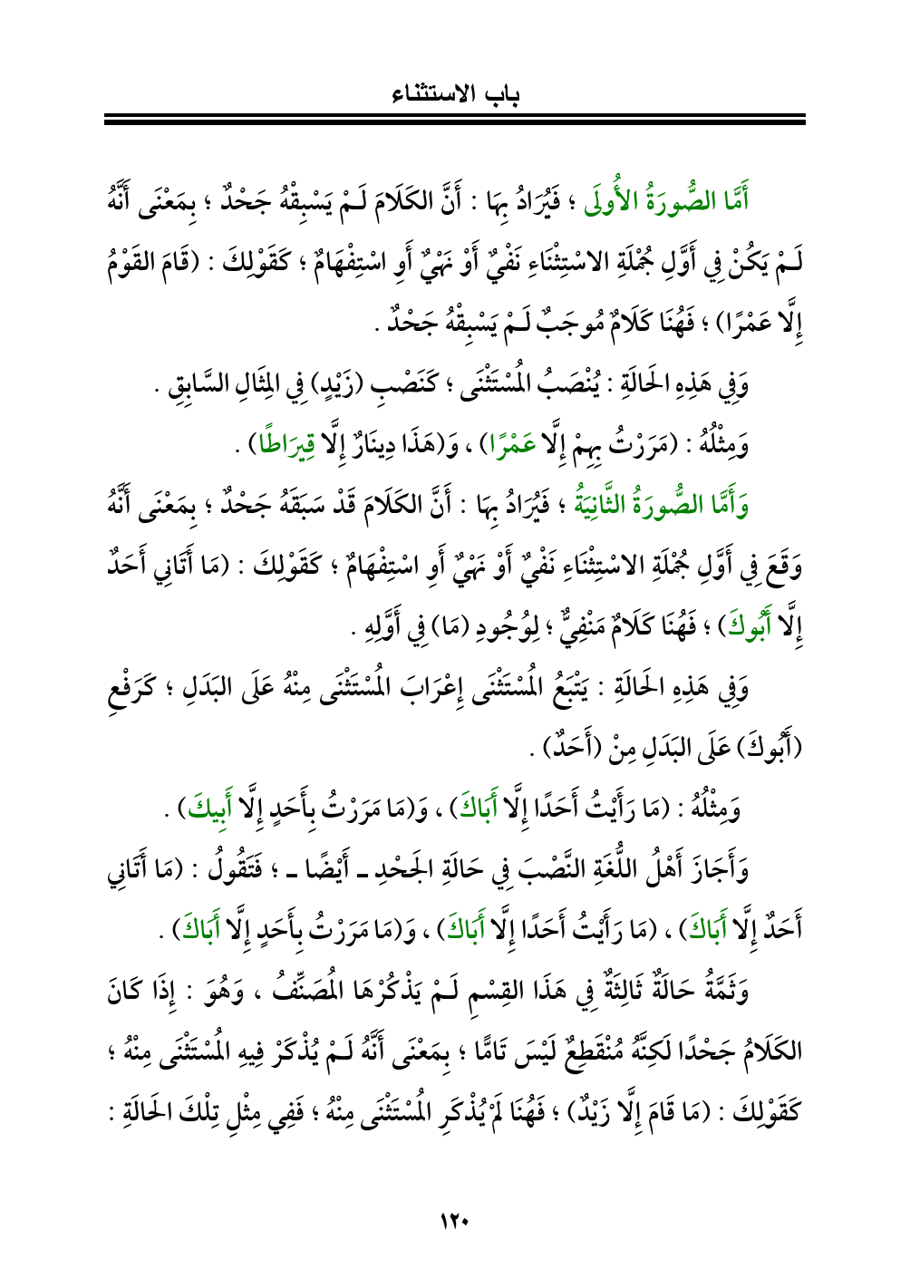 وَأَمَّا الصُّورَةُ الثَّانِيَةُ؛ فَيُرَادُ بِهَا: أَنَّ الكَلَامَ قَدْ سَبَقَهُ جَحْدٌ؛ بِمَعْنَى أَنَّهُ وَقَعَ فِي أَوَّلِ جُمْلَةِ الاسْتِثْنَاءِ نَفْيٌ أَوْ نَهْيٌ أَوِ اسْتِفْهَامٌ؛ كَقَوْلِكَ: (مَا أَتَانِي أَحَدٌ إِلَّا أَبُوكَ)؛ فَهُنَا كَلَامٌ مَنْفِيٌّ؛ لِوُجُودِ (مَا) فِي أَوَّلِهِ.