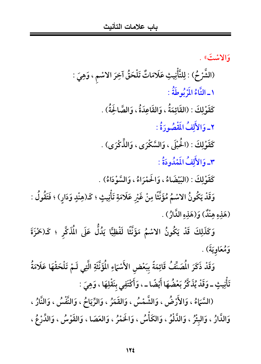 (الشَّرْحُ): لِلتَّانِيثِ عَلَامَاتٌ تَلْحَقُ آخِرَ الاسْمِ، وَهِيَ: