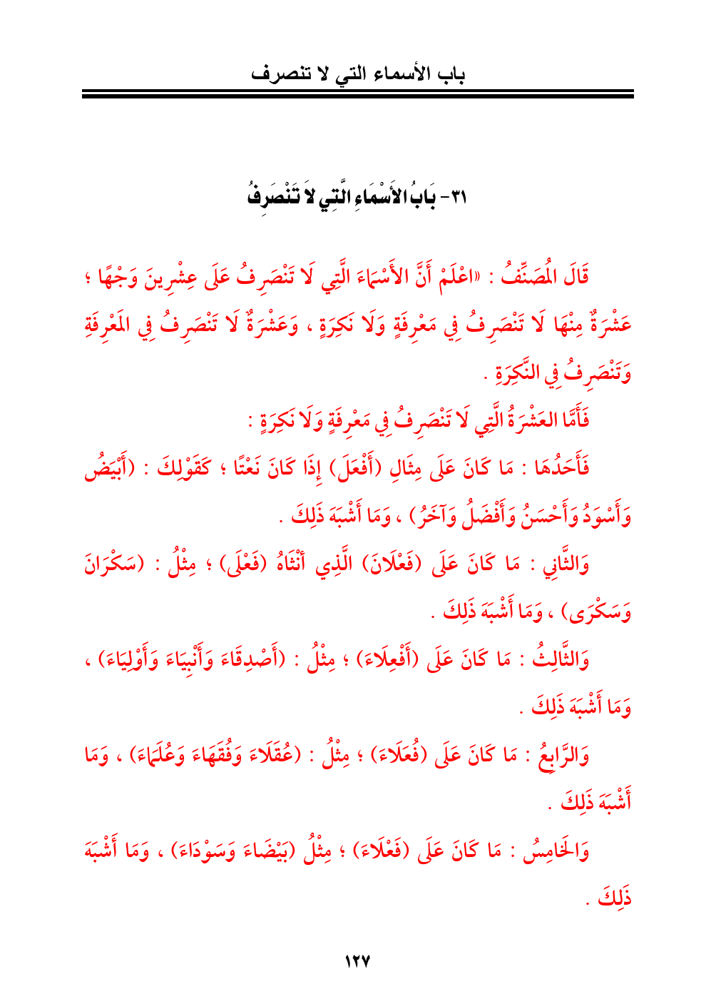 قَالَ المُصَنِّفُ: «اعْلَمْ أَنَّ الأَسْمَاءَ الَّتِي لَا تَنْصَرِفُ عَلَى عِشْرِينَ وَجْهًا؛ عَشْرَةٌ مِنْهَا لَا تَنْصَرِفُ فِي مَعْرِفَةٍ وَلَا نَكِرَةٍ، وَعَشْرَةٌ لَا تَنْصَرِفُ فِي المَعْرِفَةِ وَتَنْصَرِفُ فِي النَّكِرَةِ.