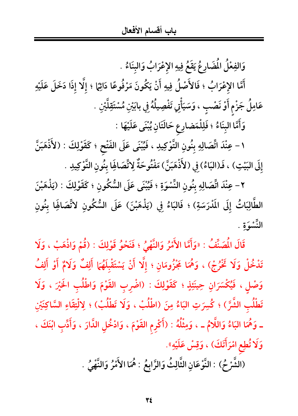 - وَهُمَا البَاءُ وَاللَّامُ -، وَمِثْلُهُ: (أَكْرِمِ القَوْمَ، وَادْخُلِ الدَّارَ، وَأَدِّبِ ابْنَكَ، وَلَا تُطِعِ امْرَأَتَكَ)، وَقِسْ عَلَيْهِ».