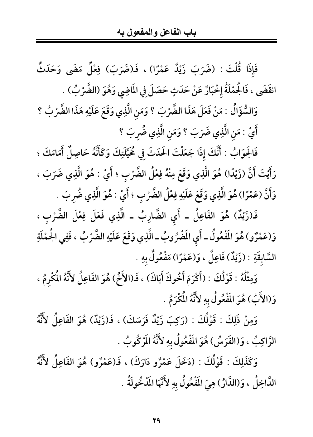 فَـ (زَيْدٌ) هُوَ الفَاعِلُ - أَيِ الضَّارِبُ - الَّذِي فَعَلَ فِعْلَ الضَّرْبِ، وَ (عَمْرٌو) هُوَ المَفْعُولُ - أَيِ المَضْرُوبُ - الَّذِي وَقَعَ عَلَيْهِ الضَّرْبُ، فَفِي الجُمْلَةِ السَّابِقَةِ: (زَيْدٌ) فَاعِلٌ، وَ (عَمْرًا) مَفْعُولٌ بِهِ.