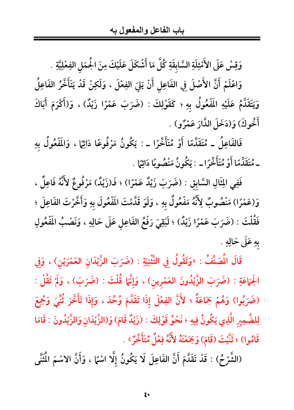 وَاعْلَمْ أَنَّ الأَصْلَ فِي الفَاعِلِ أَنْ يَليَ الفِعْلَ، وَلَكِنْ قَدْ يَتَأَخَّرُ الفَاعِلُ وَيَتَقَدَّمُ عَلَيْهِ المَفْعُولُ بِهِ؛ كَقَوْلِكَ: (ضَرَبَ عَمْرًا زَيْدٌ)، وَ (أَكْرَمَ أَبَاكَ أَخُوكَ) وَ (دَخَلَ الدَّارَ عَمْرٌو).